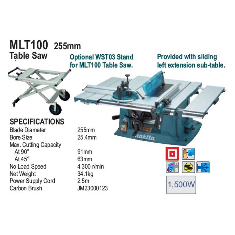 Для удобства транспортировки и работы к данной модели циркулярной пилы выпускается специальный складной стол с колесами и возможностью регулировки высоты до 25см. Для MLT100N стол является опцией и приобретается отдельно.