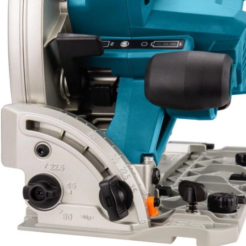 Механизм настройки глубины пропила и угла реза и скоса в пиле Makita DHS900ZU аналогичен используемому в подобных агрегатах. Критерий настройки правильной глубины такой же – под распиливаемой деталью должен выступать не более чем один зуб диска. Диапазон настраиваемых углов – до 60 град.