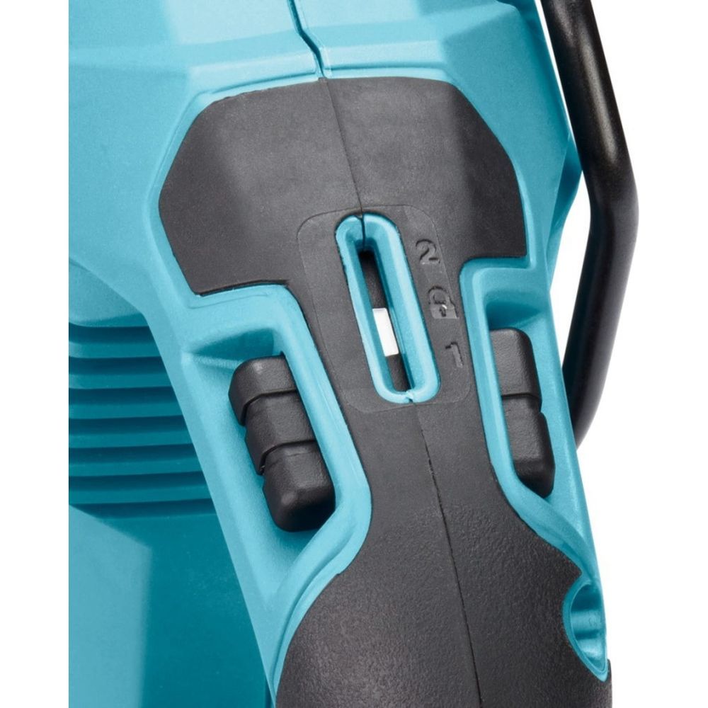 Амплитуда хода пилки в пиле Makita JR001GM201 – 32 мм. Максимальную скорость можно изменить – для этого используется рычаг, который выполняет ещё и функцию блокировки привода. Расположен он в верхней части рукоятки инструмента. Рабочая частота  имеет два значения - 2300 или 3000 в минуту. Высокая скорость рекомендуется при распиле дерева или ячеистого бетона. Алюминий, чугун и нержавейку лучше разделывать на меньшей частоте.