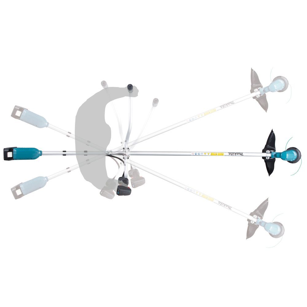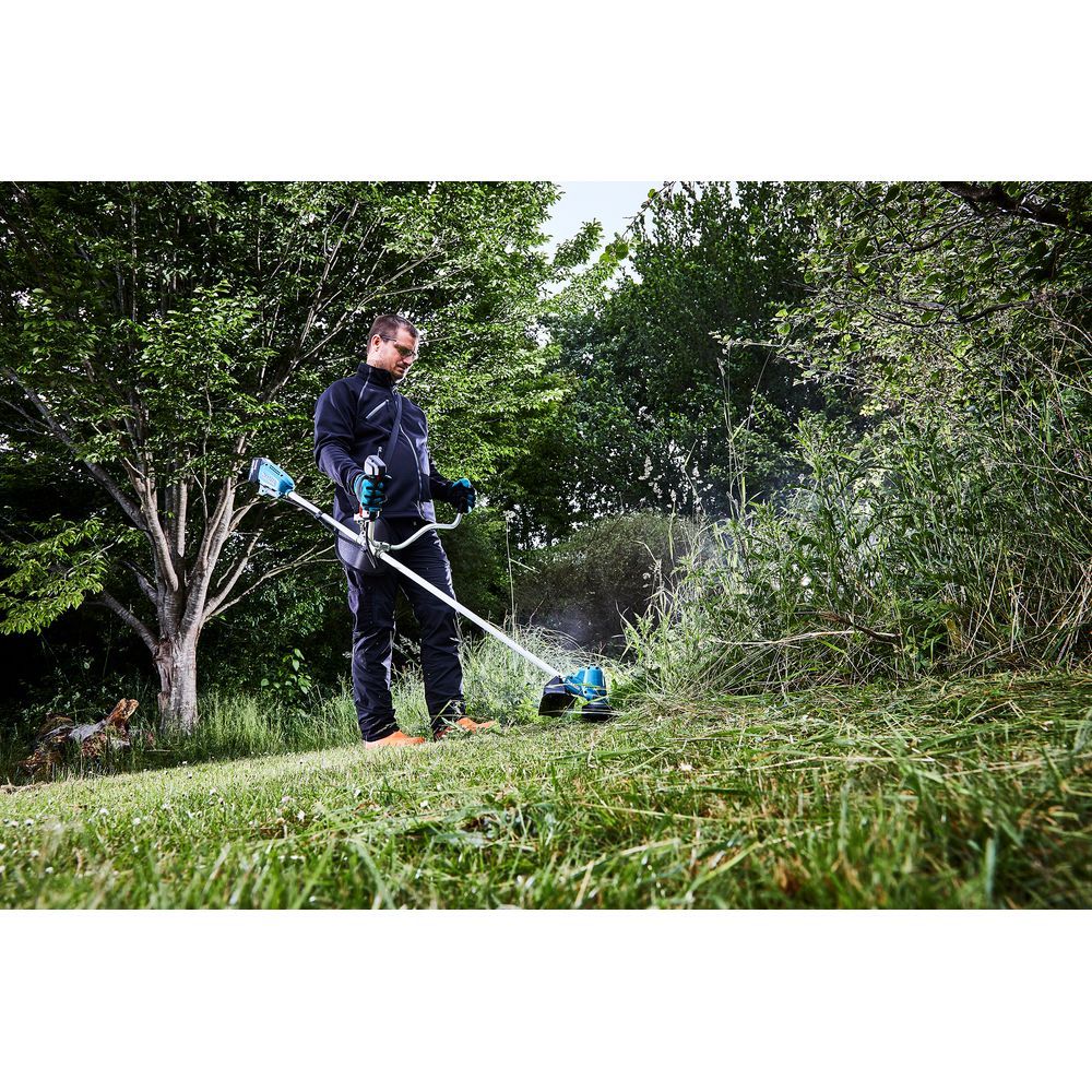 Триммеры с аккумуляторным питанием давно производятся компанией Макита, и в 2021 году их ряд дополнился несколькими интересными моделями. Агрегат Makita DUR190UZX3 с «велосипедной» рукояткой сосредоточил в своей конструкции весь опыт производства и эксплуатации «электрокос». Его мощности хватает для производительной работы (ширина скашивания – 30 см) – привод питается от батареи напряжением 18 Вольт.
