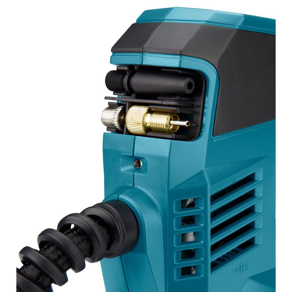 Манометр в насосе Makita DMP180Z расположен вверху и хорошо виден – способствует этому и встроенная подсветка. Кнопочное управление позволяет задать единицу измерения и величину давления, до которого нужно накачивать шину. Оно задается парой кнопок. Диапазон – от 20 кПа до 830 кПа. Следует помнить, что у агрегата есть лимит непрерывной работы – 5 минут. После этого требуется сделать перерыв в несколько минут.