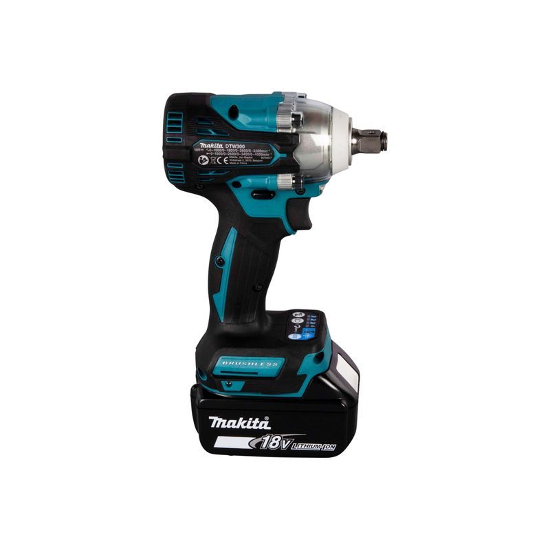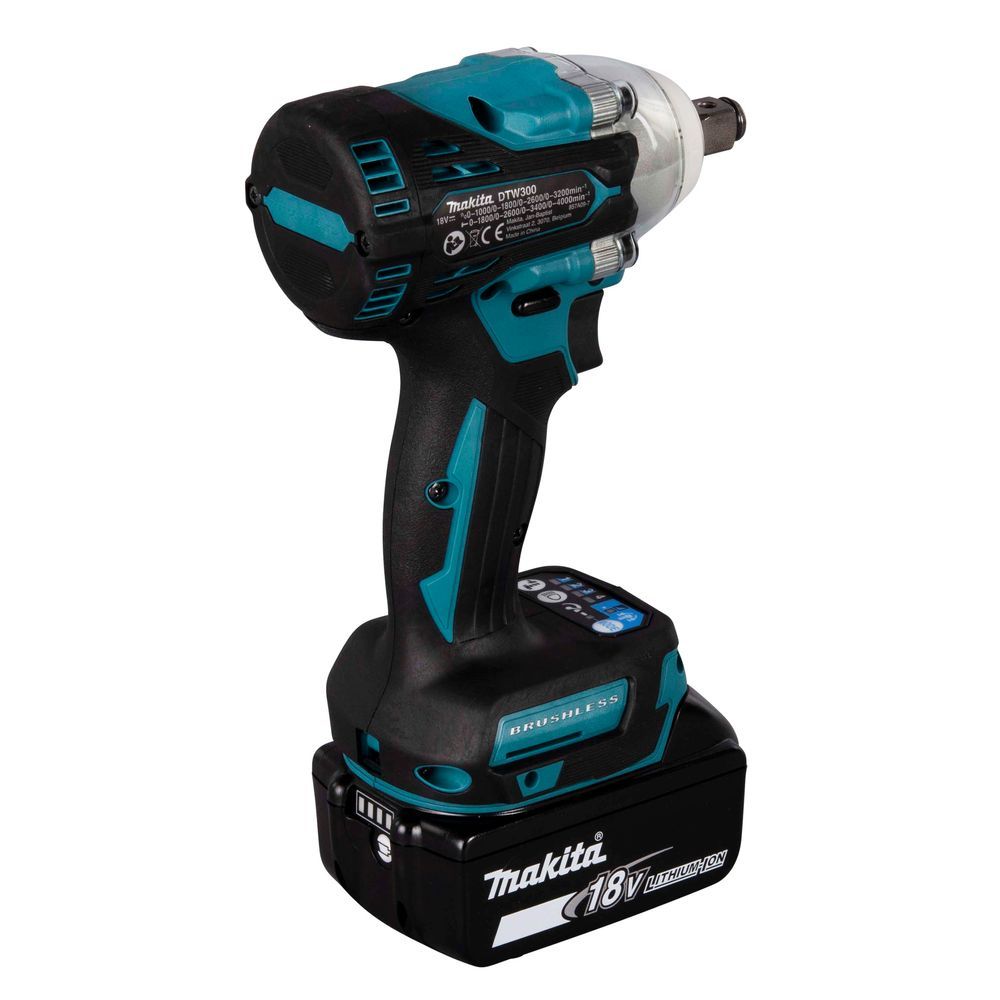 Профессиональный инструмент должен выполнять свои функции длительное время, то есть, иметь увеличенный ресурс. В 2021 году компания Макита продолжила серию аккумуляторных гайковертов именно такой моделью -  Makita DTW300RTJ. Этот агрегат поставляется без батареи и рассчитан на питание от популярного слайдера BL18XX напряжением 18 Вольт и любой емкости. Особенность инструмента – бесщеточный привод с повышенной эффективностью и удобное электронное управление режимами.