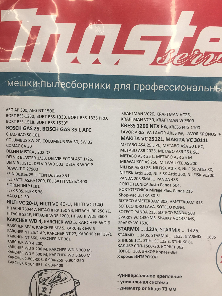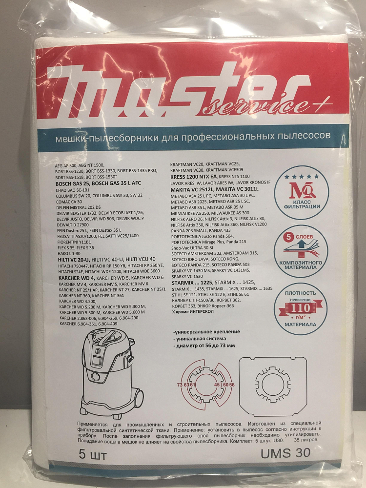 Мешки для пылесосов универсальные 35 литров 5шт в упаковке, класс фитрации М. Подойдет к пылесосам с диаметром крепления от 56мм до 73мм, таких брендов как makita,bosch,hilti,karcher и д.р. 5-ти слойный композитный материал. Плотность мешка 110г/м2