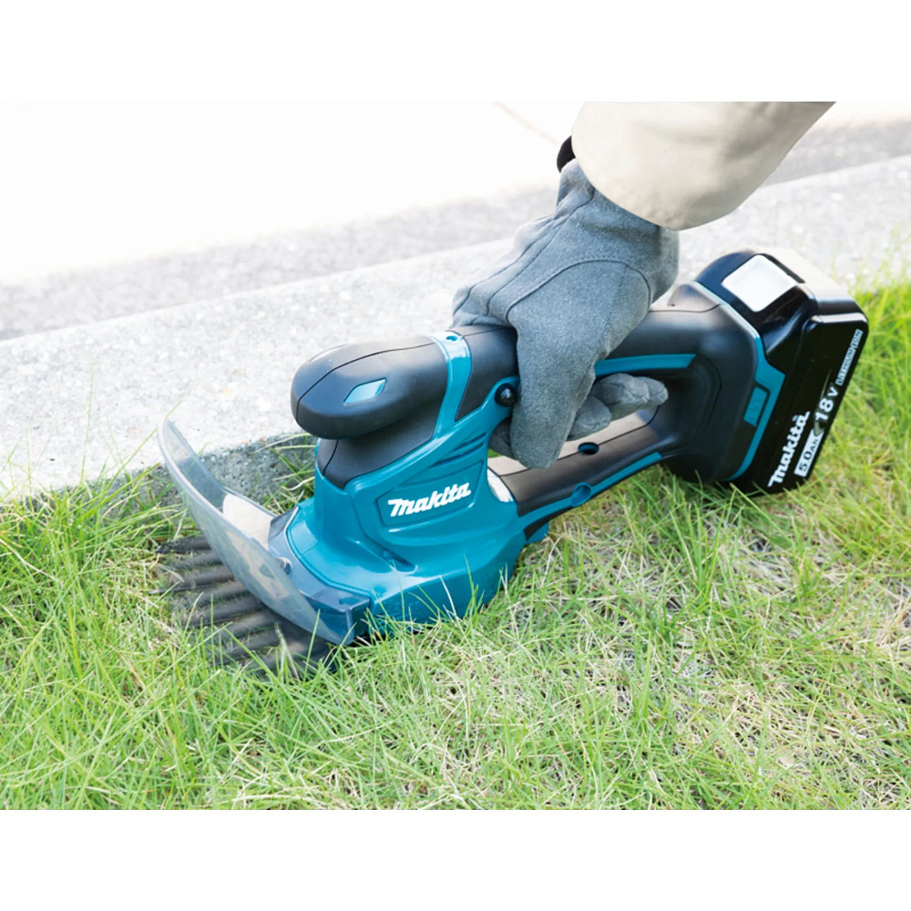 Привод в ножницах Makita DUM111SYX включается при нажатии на курок, частота хода лезвий 1250 в минуту. Случайное нажатие исключено за счет кнопки разблокировки, которая доступна с обеих сторон рукоятки. Мощности двигателя достаточно для срезания веток диаметром до 8 мм, а ширина скашивания травы у описываемой модели – 16 см.