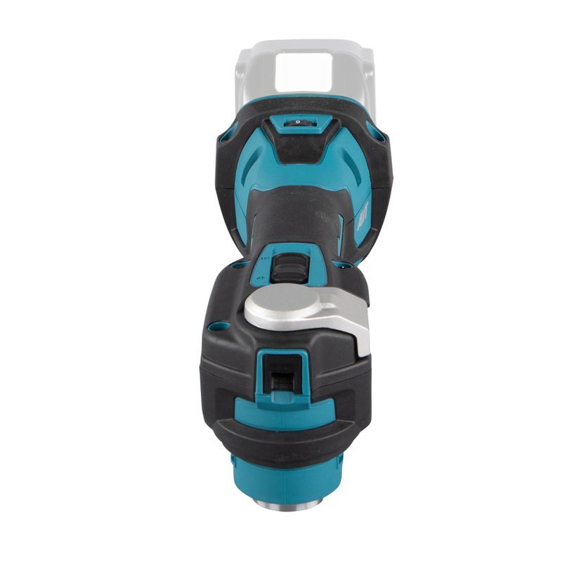 Рабочий орган мультитула Makita DTM52Z перемещается орбитально с углом отклонения 3,6 град и частотой до 20 тысяч колебаний в минуту. Скорость можно изменить с помощью шестипозиционного регулятора, а включается привод агрегата с помощью ползункового переключателя. Одновременно с этим включается и подсветка рабочей зоны, светодиод которой используется в качестве индикатора при недопустимом разряде или перегреве аккумулятора. Подсветка при этом начинает мигать.