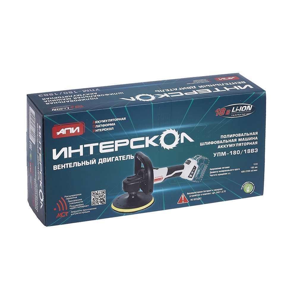 Угловая полировальная машина с бесщеточным (вентильным) двигателем ИНТЕРСКОЛ УПМ-180/18ВЭ Interskol Высокая энергоэффективность и производительность, мощность и надежность благодаря вентильному бесщеточному приводу;