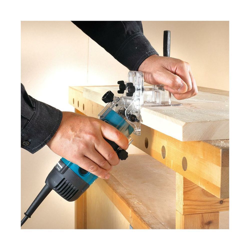 Пригоден этот агрегат и для вырезания отверстий и пазов в заготовках из различного материала – от дерева и шпона до ламината и МДФ. Пользователь фрезера Makita 3712 получает, кроме того, и другие немаловажные преимущества: