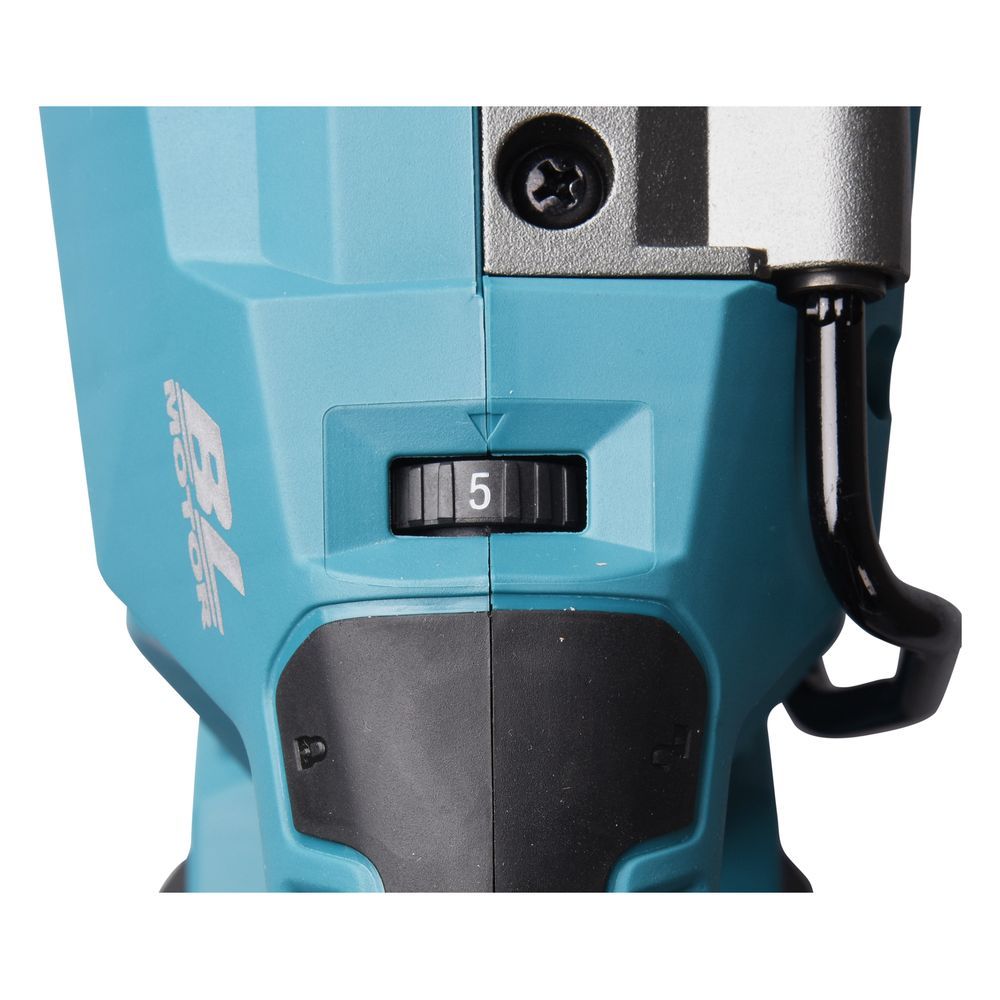 В инструменте Makita JR002GZ используется бесщеточный привод типа BL c электронным управлением. Число оборотов регулируется от нуля до 3 тыс. в минуту. Обратная связь в контроллере агрегата позволяет поддерживать заданную скорость постоянной, независимо от твердости распиливаемого материала. Запуск и управление скорость традиционное -  за счет нажатия и увеличения давления на курок. Есть и защита от случайного нажатия – для включения необходимо нажать кнопку разблокировки.