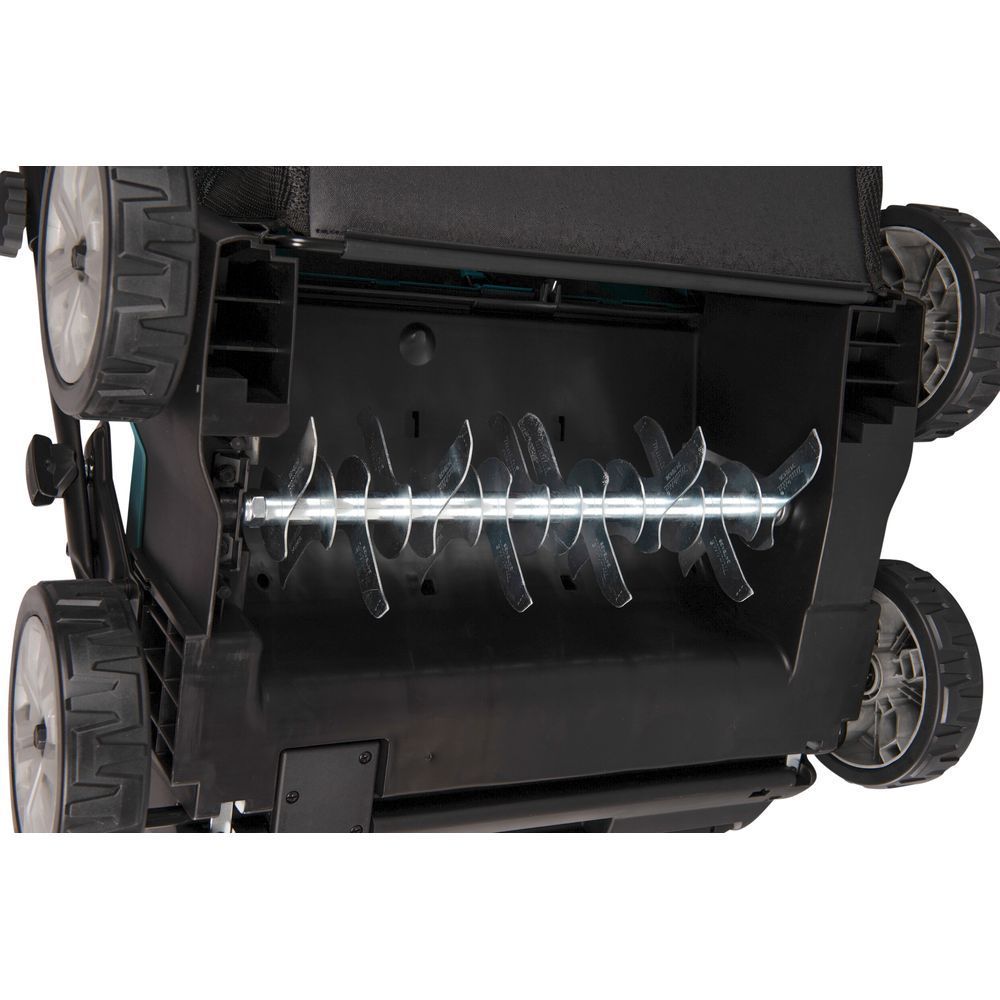 Подача питания на привод скарификатора Makita UV001GM201 осуществляется переключателем, имеется индикатор питания. В нормальном режиме он светится зеленым цветом, а при срабатывании защиты начинает мигать красным или зеленым в зависимости от причины блокировки двигателя. Сам привод ножей включается отдельной кнопкой и рычажным выключателем.