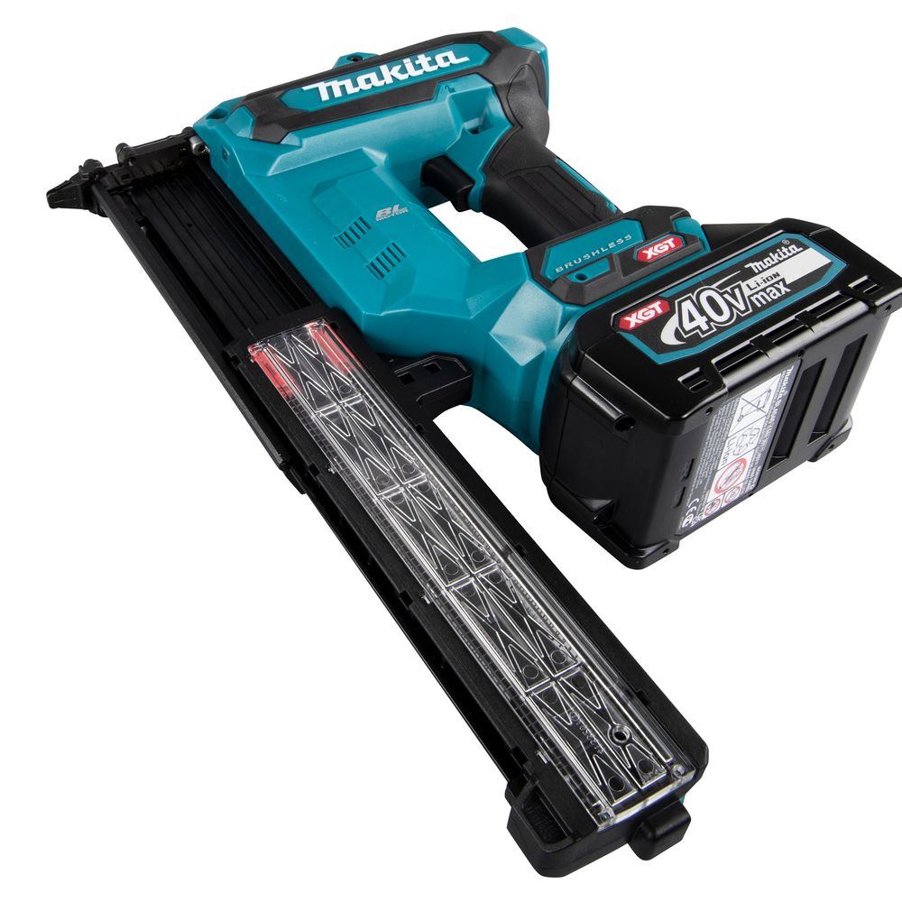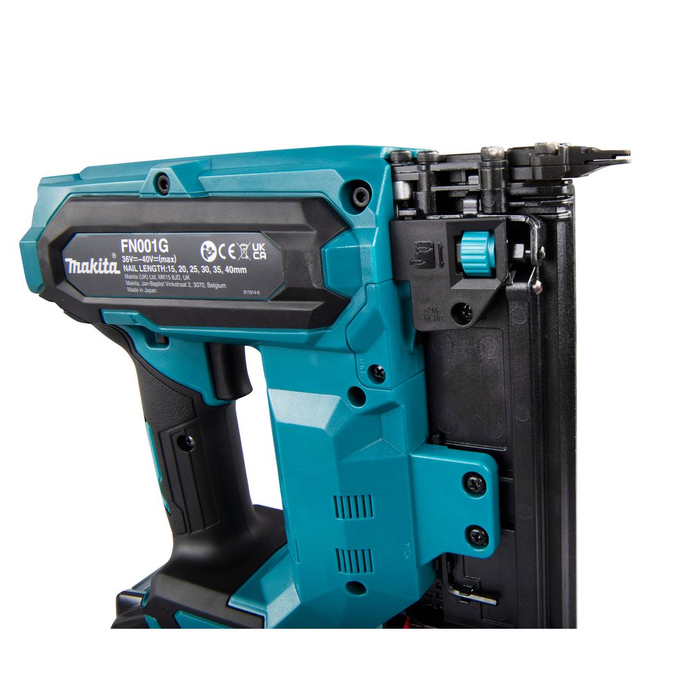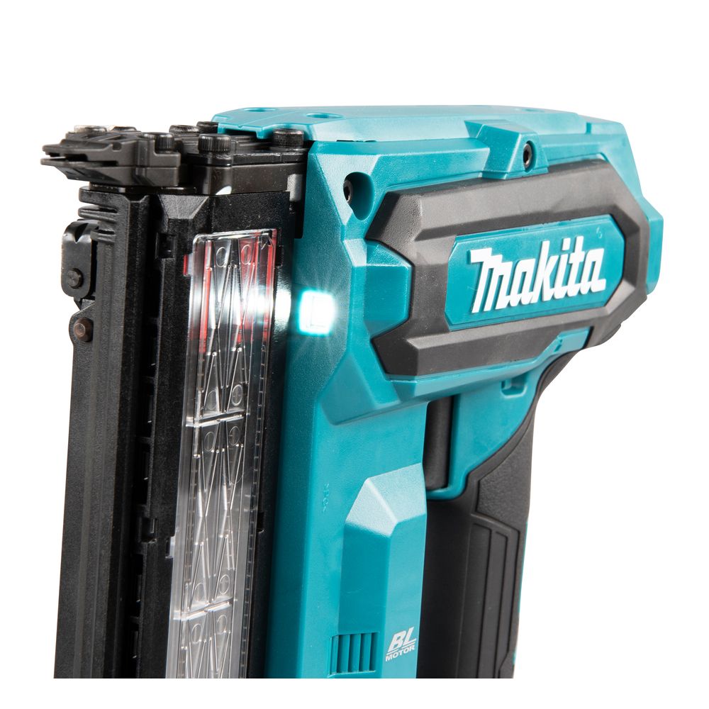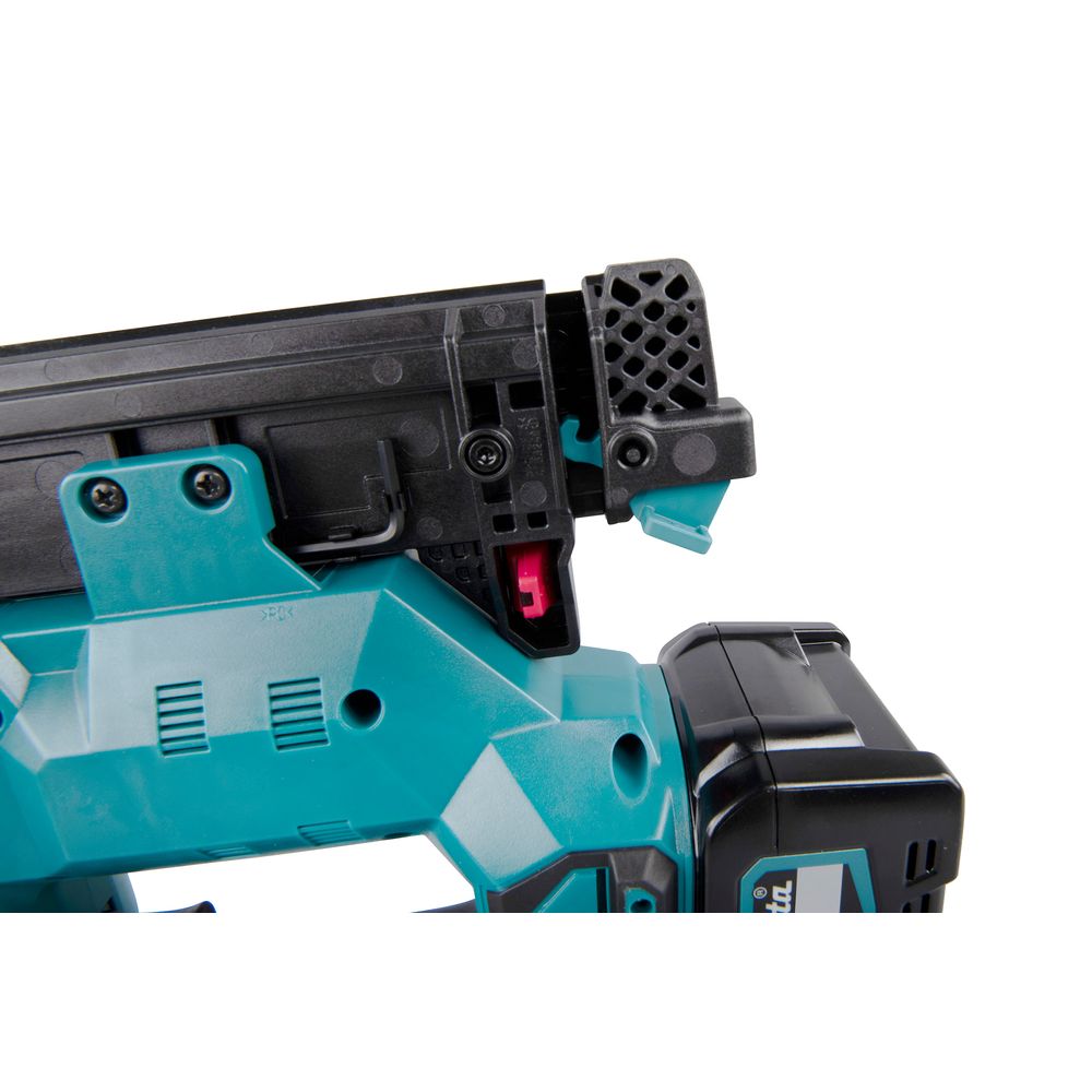 Магазин инструмента рассчитан на установку стандартной обоймы, а в задней части магазина предусмотрено место для хранения адаптера головки, используемого при работе по легкоповреждаемой поверхности. В инструменте Makita FN001GZ предусмотрена защита от «холостого выстрела» при отсутствии в магазине гвоздей. Их наличие и количество можно увидеть через прозрачное окошко с красным индикатором.