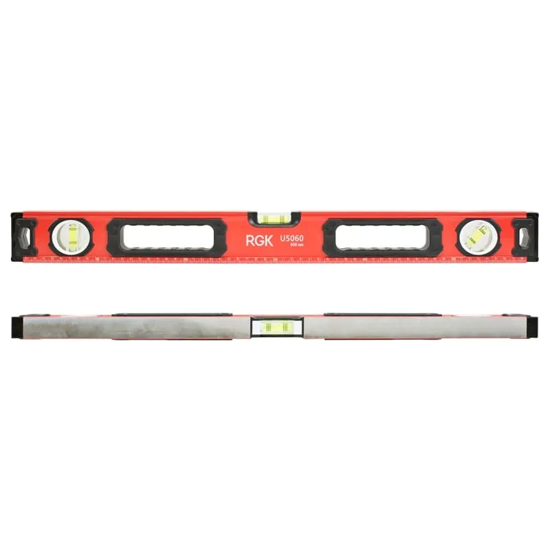 Строительный уровень RGK U5060 длиной 60 сантиметров оснащен двумя магнитами на противоположных сторонах для крепления уровня на металлической поверхности, чтобы освободить руки при проведении разметки.