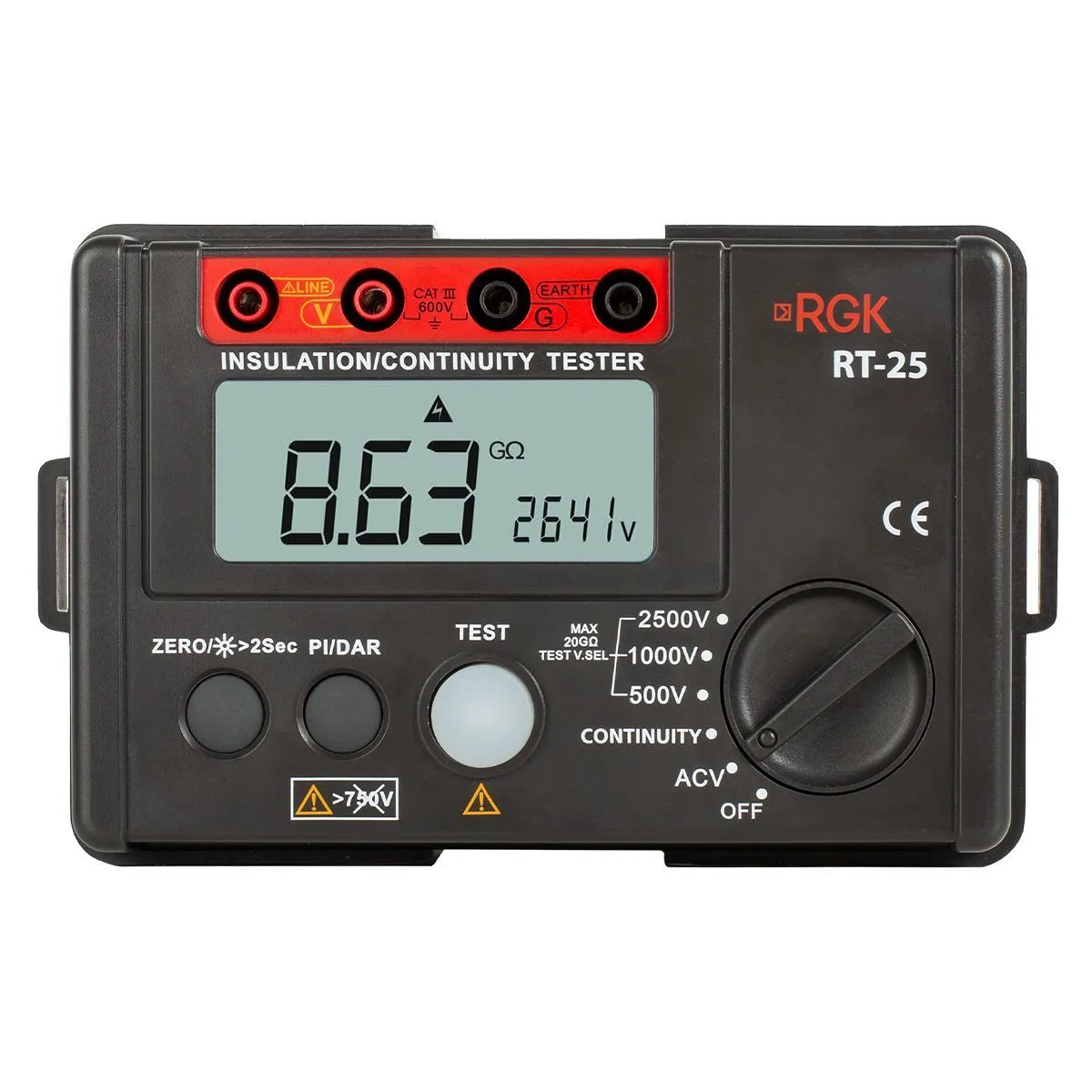 Электронный мегаомметр RGK RT-25 защищен от скачков напряжения по классу CAT III 600В и может применяться для замеров на коммутационном оборудовании, распределительных щитах, фидерах и трехфазных сетях.