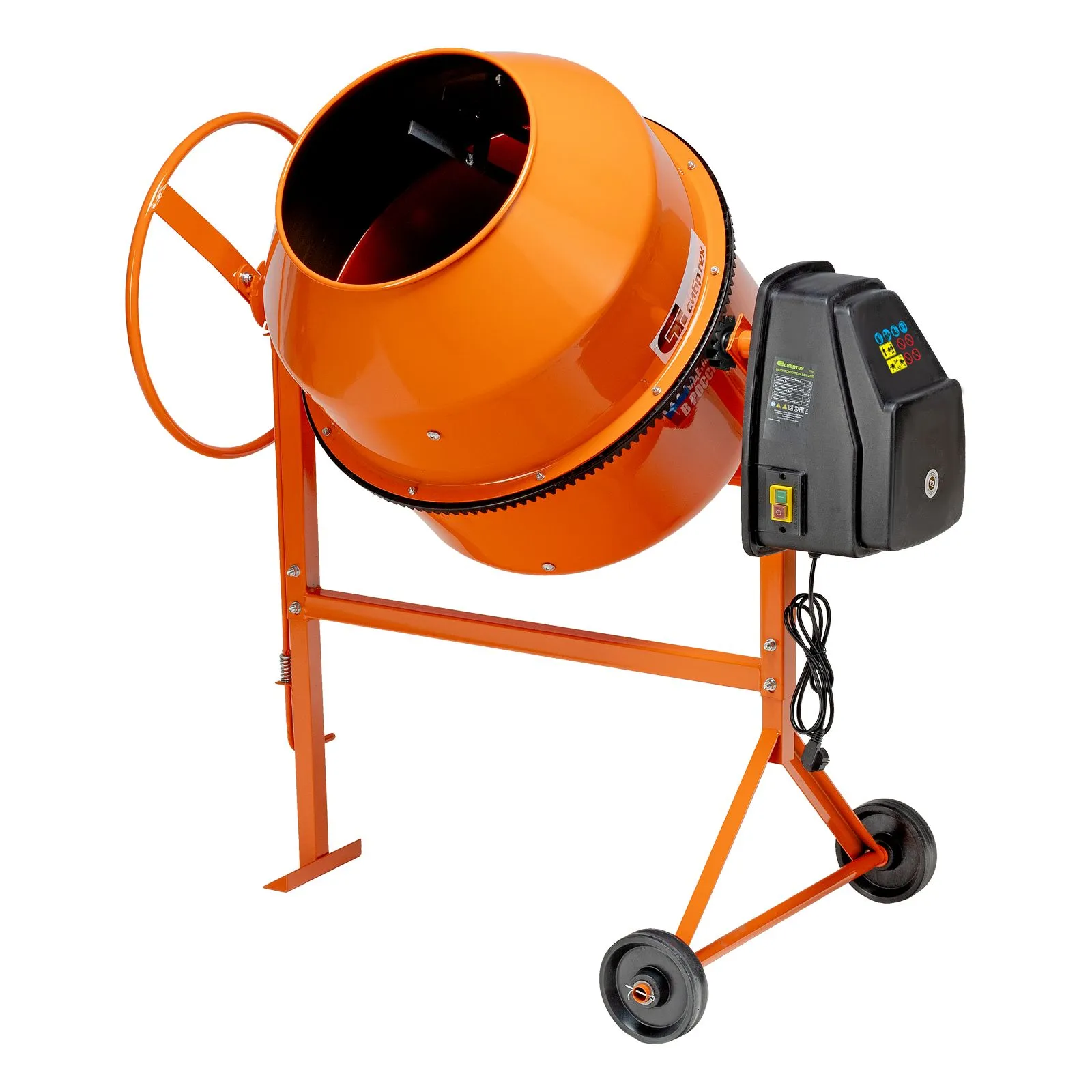• Мобильность — прочные колеса облегчают перемещение бетоносмесителя по рабочей площадке.