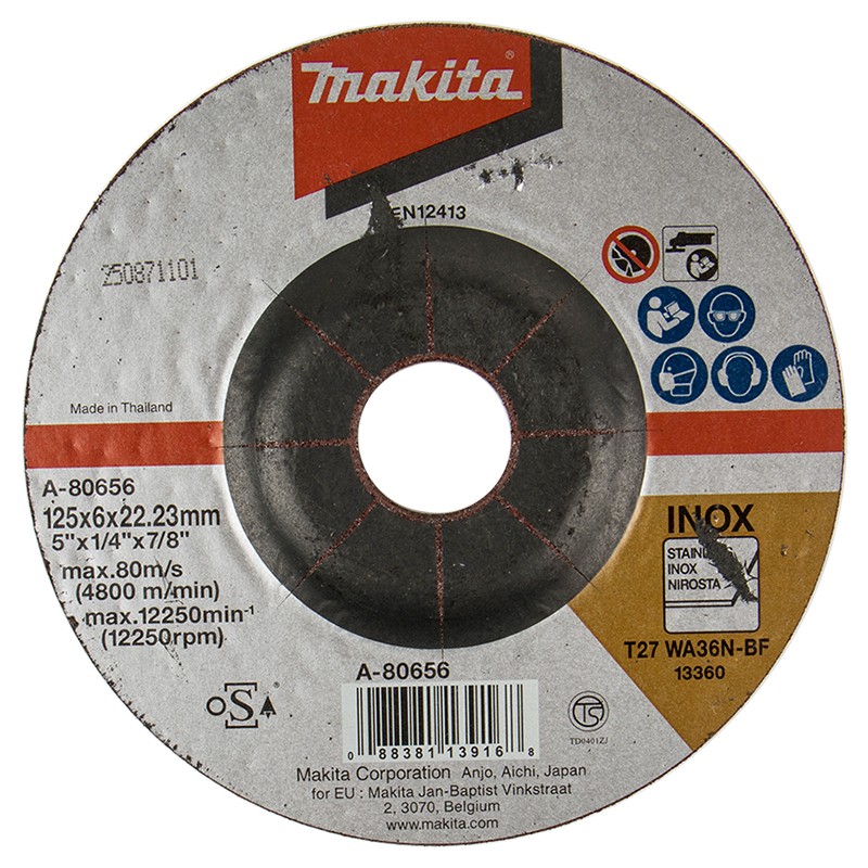 Шлифовальный диск c вогнутым центром Makita A-80656 предназначен для нержавеющей стали. Диаметр 125 мм. Толщина 6 мм. Посадочное отверстие 22.23 мм.