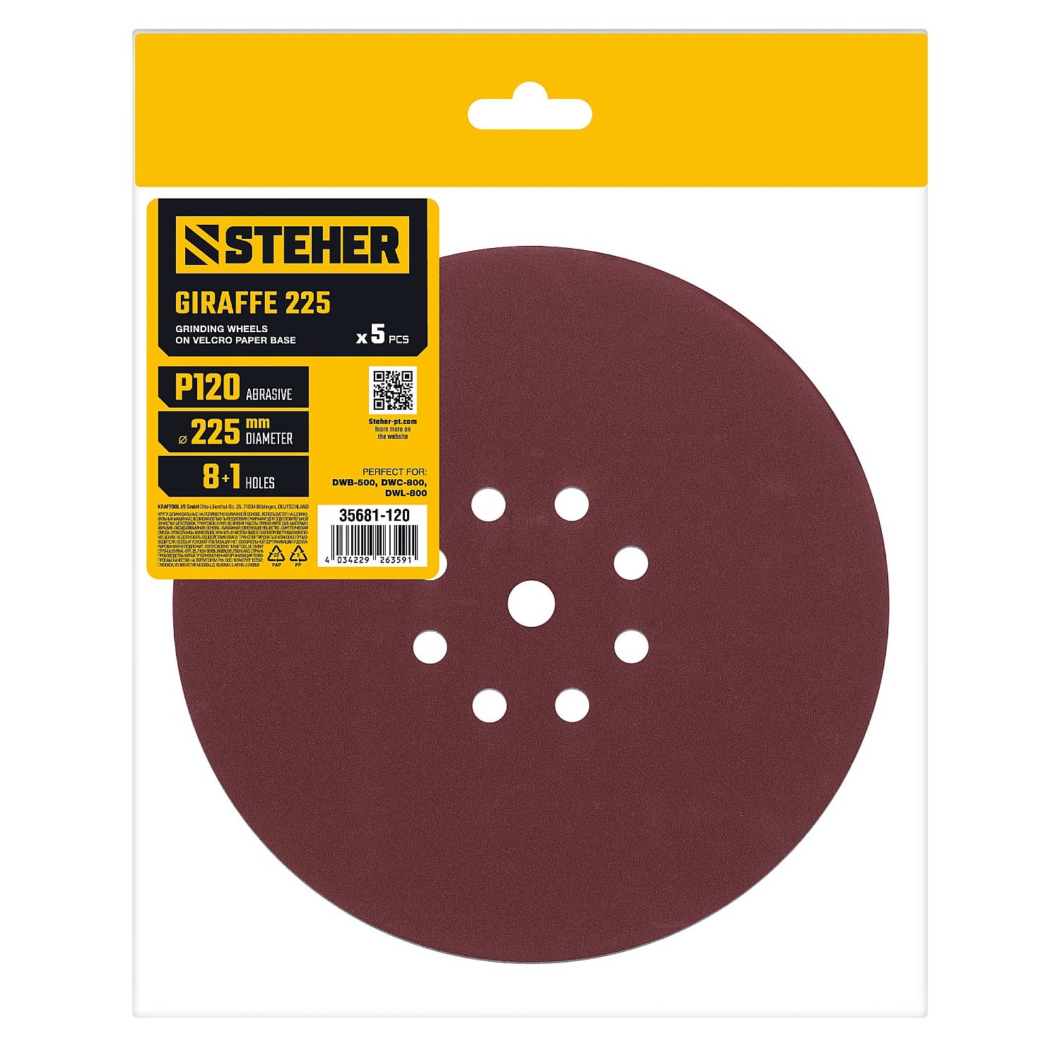 Диск шлифовальный на липучке D225мм, P120, 5 шт. STEHER GIRAFFE (35681-120)