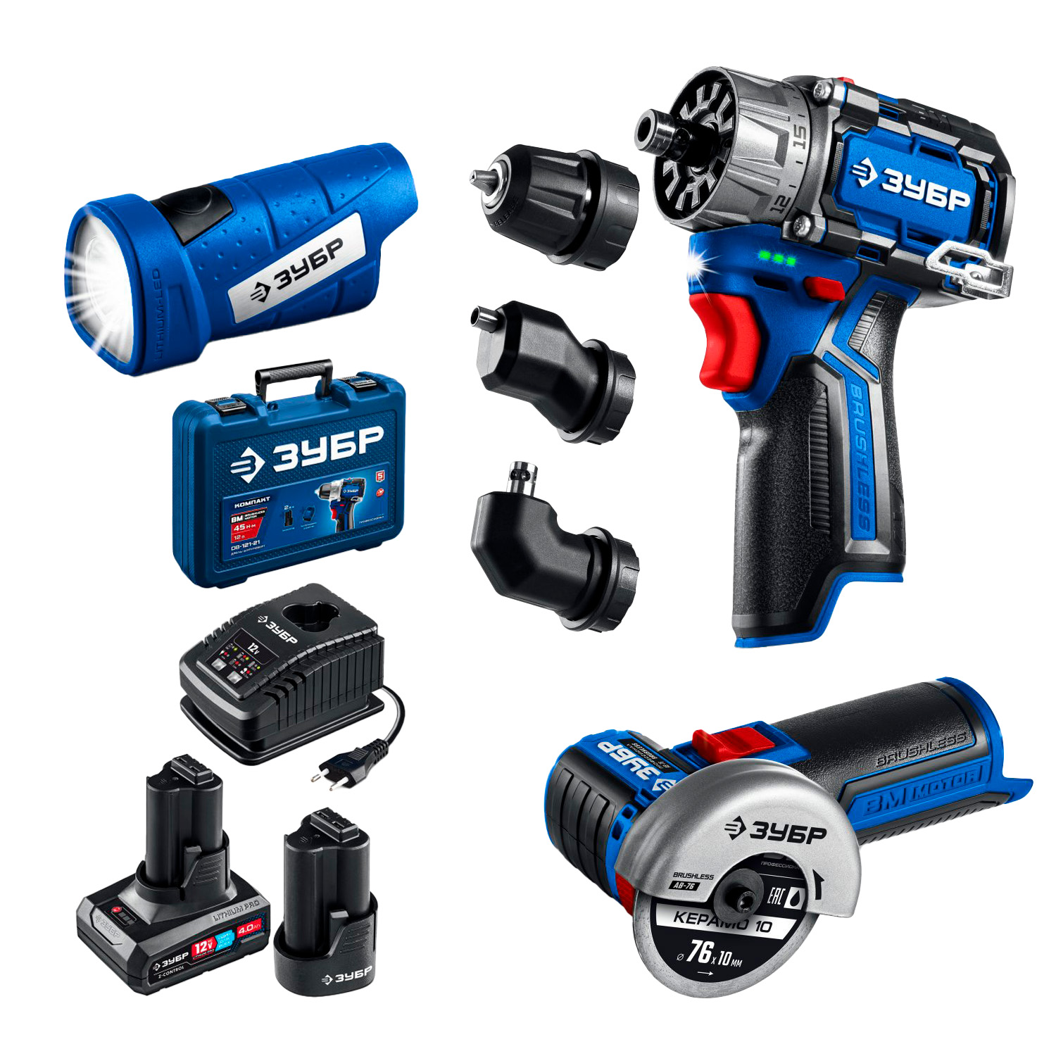 Аккумуляторный набор ЗУБР DB-125-42ABF: шуруповерт+мини-ушм+фонарик+2 акб, кейс