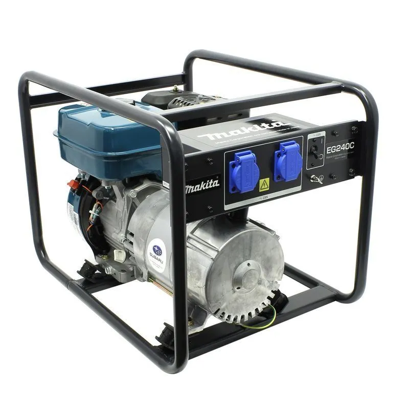 Силовая установка бензинового генератора Makita EG240C выполнена на базе одноцилиндрового двигателя с воздушным охлаждением и объёмом 169 куб.см. Имя его производителя говорит само за себя – Subaru-Robin. Это специализированный мотор типа EX17, работающий по 4-тактной схеме, имеющий верхнее расположение клапанов и электронную систему зажигания. Такая схема обеспечивает в совокупности повышенную экономичность, эффективность и при этом малый уровень шума и вибрации.