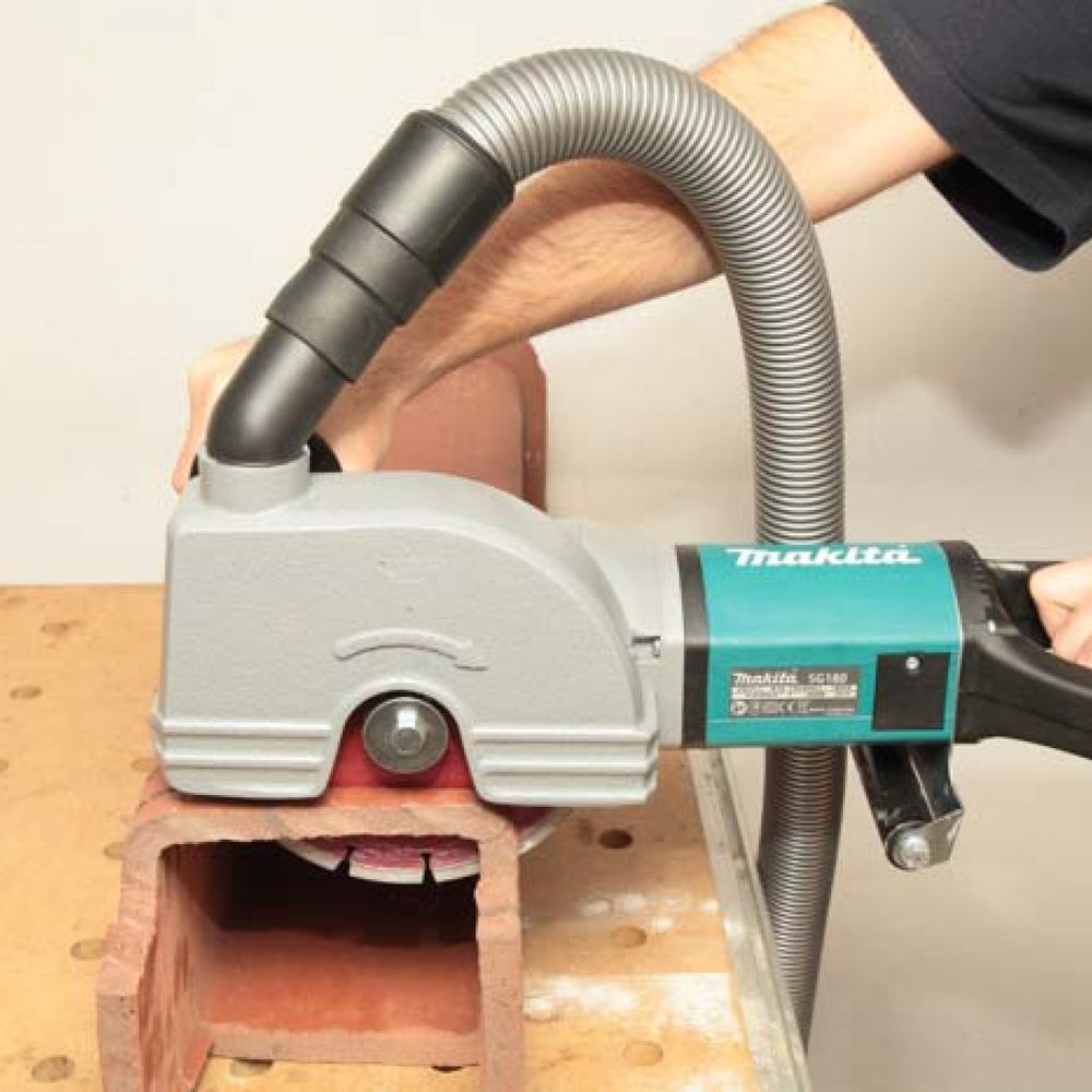 Профессиональный штроборез Makita SG180 способен формировать в бетоне или кирпичной кладке каналы глубиной до 6 см и шириной от 0,8 до 4,3 см. Принцип работы аналогичен используемым в «болгарках», только в нём устанавливается не один, а пара дисков с регулируемым расстоянием. В описываемой модели устанавливаются диски диаметром 18 см со стандартным посадочным отверстием 22,2 мм.