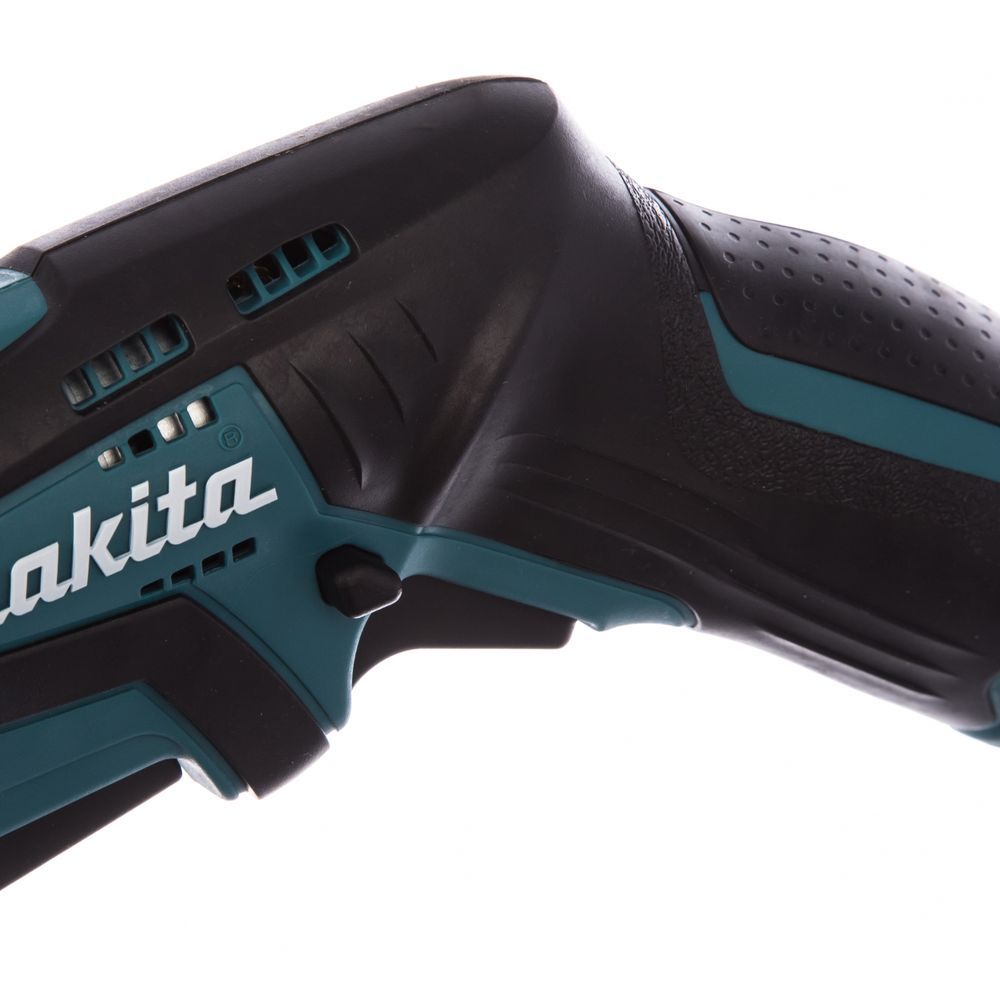 Makita JR100 DZ позволяет работать в любом положении, удерживая инструмент за корпус или рукоятку. Для этого на корпусе и ручке расположены два дублирующих выключателя. Также с двух сторон от корпуса дублируется кнопка блокировки включения.
