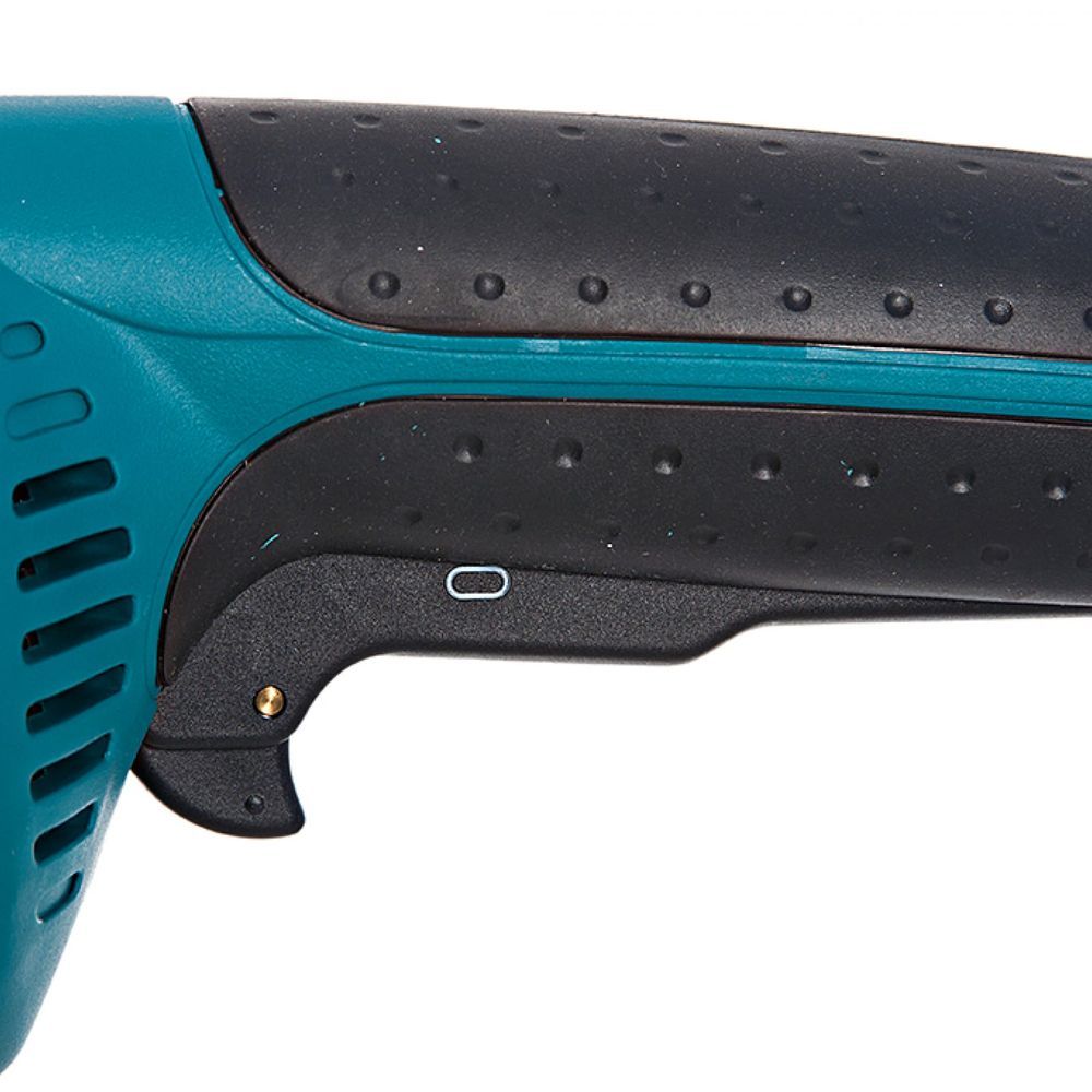 Основная рукоятка приспособлена для удобного захвата одной рукой и имеет, помимо этого, специальные мягкие накладки. Выключатель практически является её продолжением и выполнен в виде большого курка. Нажимать на него можно всеми пальцами, не снимая руки с рукоятки. Имеется у инструмента Makita GA9020SFK и возможность фиксации включенного состояния специальным рычагом-блокиратором. Он удобно расположен рядом с курковым выключателем и имеет двойное назначение – может использоваться для блокировки случайного включения.