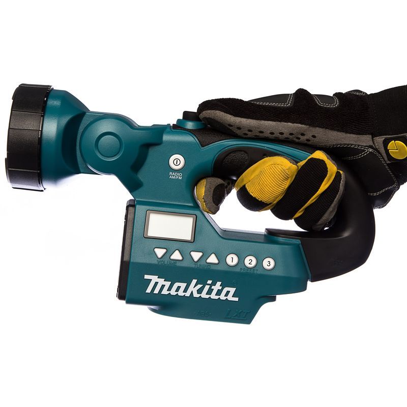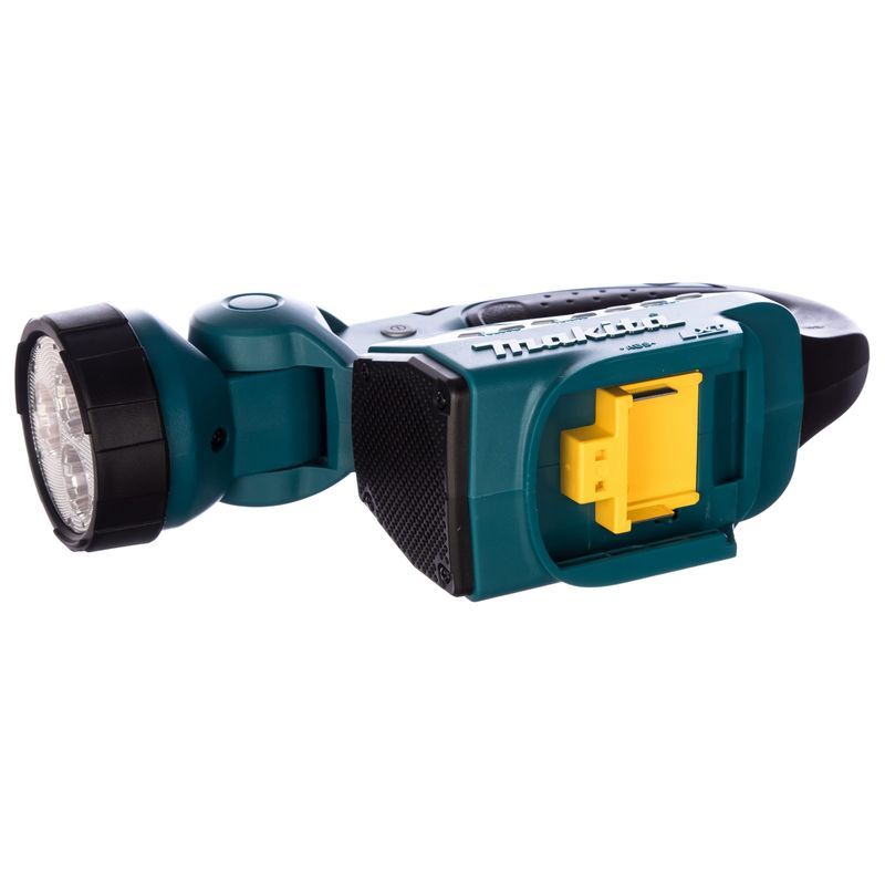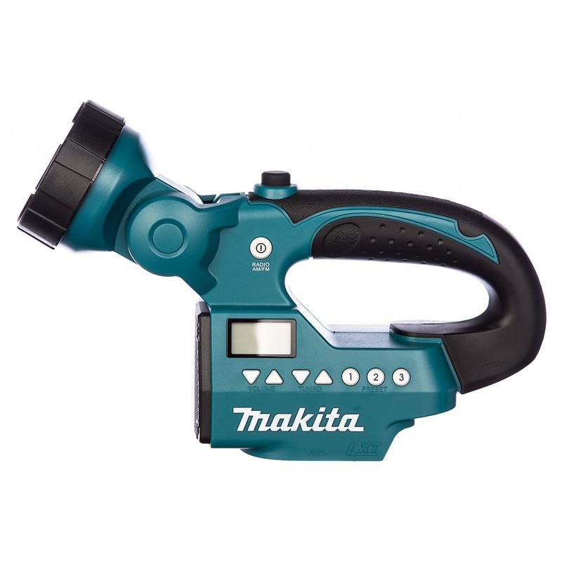 Радиофонарь с питанием от аккумуляторных блоков Макита напряжением 14 или 18 В. Диапазоны - FM и MW, звуковая мощность 3 Вт, поворотный светильник с тремя светодиодами