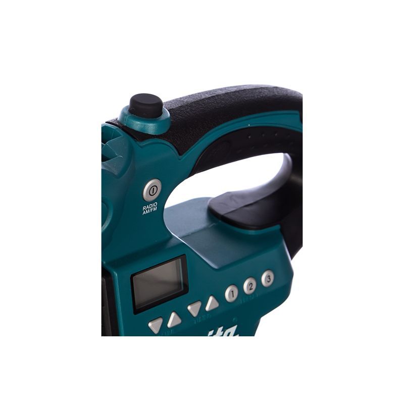 Управление у приемника Makita BMR050 – электронное, кнопочное. С их помощью производится выбор диапазона и поиск станции. Возможна и ручная настройка, а также сохранение трех станций для каждого диапазона в памяти. Регулировка громкости – также кнопочная, причем максимальное значение выходной мощности достигает 3 Вт. Встроенный динамик такой мощности обеспечивает разборчивый и чистый звук.