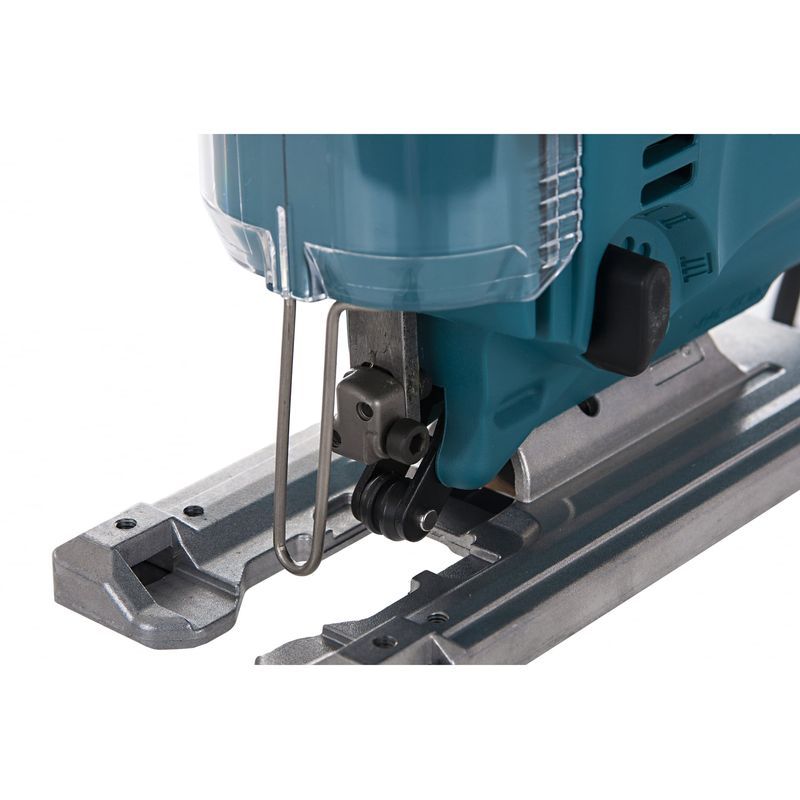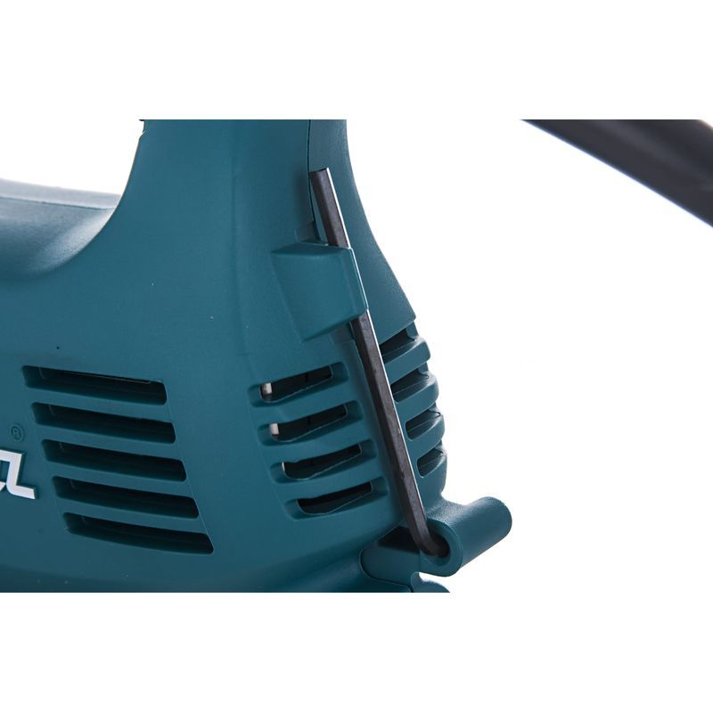Чистота и безопасность работы складываются из различных факторов. Для защиты пользователя от пыли и стружки на передней части корпуса лобзика Makita 4329 КX1 расположен подвижный прозрачный кожух, позволяющий следить за линией реза и способствующий лучшему пылеудалению. Для подключения инструмента к пылесосу предусмотрен специальный пылевыводящий патрубок.