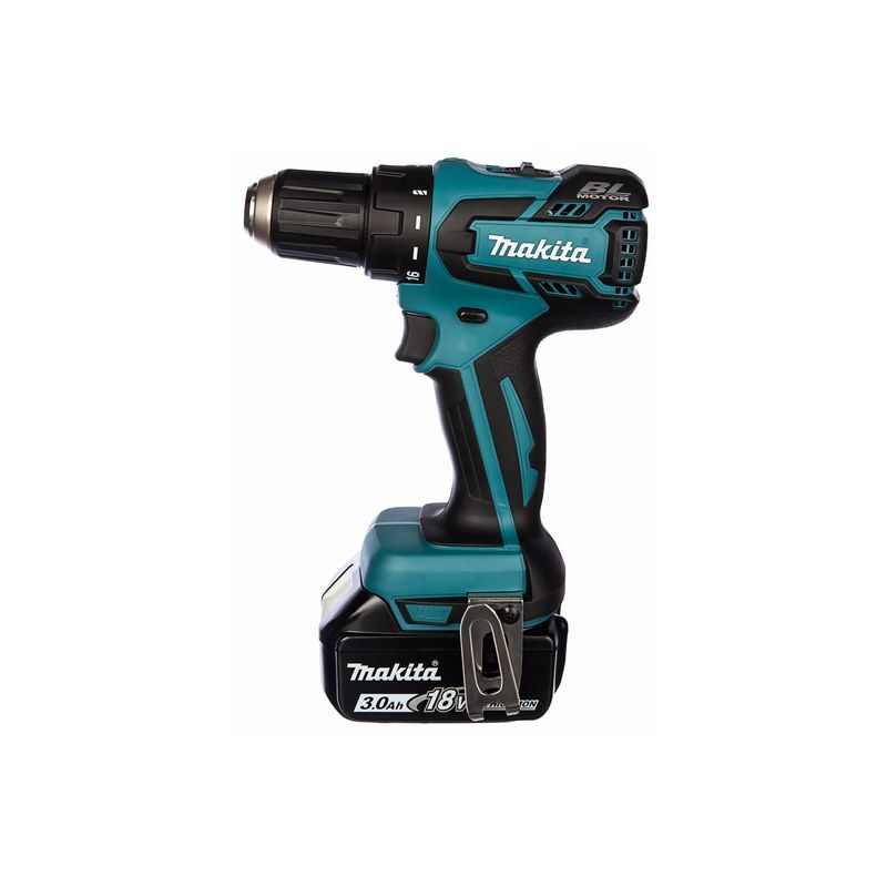 Работает дрель-шуруповерт макита DDF459RFE от аккумулятора напряжением 18В. Разъем типа слайдер позволяет использовать обычные батареи емкостью 3Ач или 4Ач, а также узкие облегченные емкостью 1.3Ач.