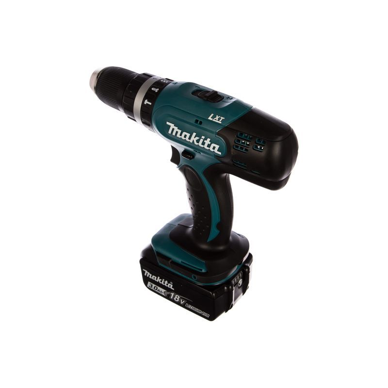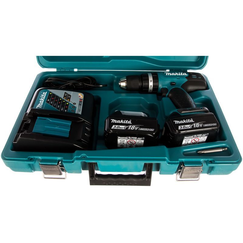 Такие возможности дрели Makita DHP453RFE обусловлены электроприводом с повышенным напряжением питания. Литиево-ионнный аккумуляторный блок в слайдерном конструктиве выдаёт напряжение 18 В и имеет ёмкость 3 А-час. К слову, в комплекте поставки дрели этих блоков два.