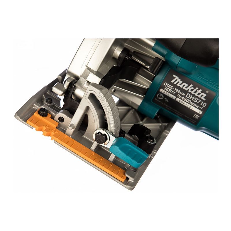 Кожух у Makita DHS710RM2J - из магниевого сплава, легко открывается большим рычагом. Шкалы угла реза и его глубины никогда не сотрутся – они выдавлены на основании. Продуманная конструкция позволяет при работе хорошо видеть линию реза. О точности пропилов также можно не беспокоиться – у инструмента имеются все необходимые приспособления для настройки углов и параллельности реза.