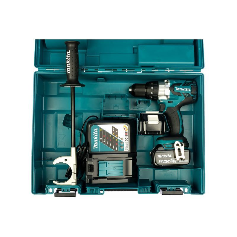 18В, 2х5 Ач Li-ion, быстрозажимной патрон 13мм, 0-550/ 0-2100об/мин, 60/115 Нм, 2.6кг, чемодан, подсветка, боковая рукоятка