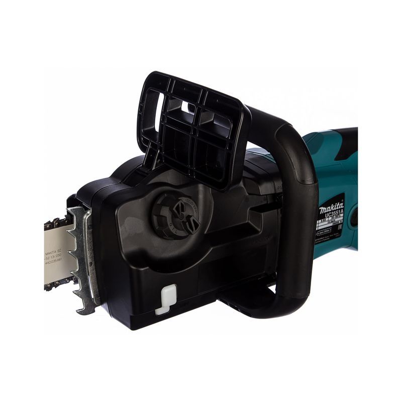 Наличие автоматической смазки цепи в пилах производства Макита – в общем-то, стандартно, имеется она и у этой модели. Для его контроля в пиле Makita UC3551AX1 имеется уровнемер. Безопасность агрегата обеспечивается тормозом цепи, срабатывающем не только при сдвиге ограждения руки вперед, но и блокировкой движения цепи в выключенном состоянии, сразу после отпускания  куркового выключателя. В конструкции пилы имеется и заднее ограждение, а также уловитель цепи, исключающий получение травмы при её обрыве. Таким образом, защита пользователя предусмотрена в любой ситуации.