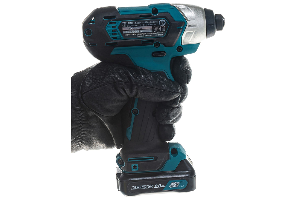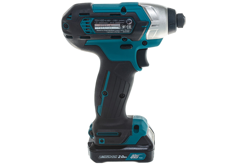 Механического переключения передач у гайковерта Makita TD110DWAE нет, а максимальная скорость на холостом ходу у него составляет 2300 об/мин. или 3000 ударов в минуту. Максимального крутящего момента 110 Нм ему вполне хватает для работы даже с высокопрочными болтами, развивает его привод, питающийся от литиево-ионного аккумулятора напряжением 10,8 В и емкостью 1,3 А-час.