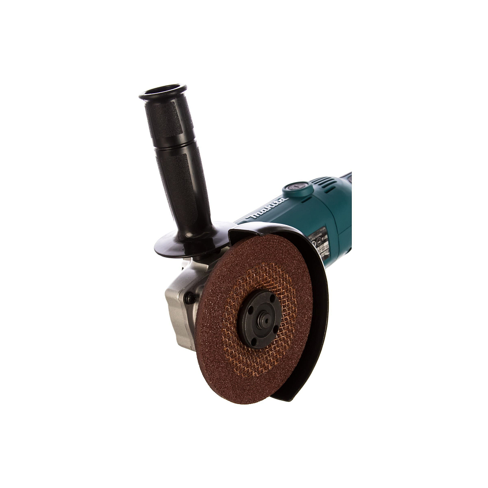 Компоновка шлифмашины Makita GA5021 традиционна для инструмента этого класса, можно только дополнительно отметить прекрасную сбалансированность габаритов (длина – 39 см) и веса – его значение 2,5 кг. Дополнительную рукоятку можно закрепить с любой удобной стороны. Она входит в комплект поставки, как и весь необходимый для установки диска крепёж и инструмент, а также защитный кожух. Кстати, его перестановка вообще не требует никакого инструмента.