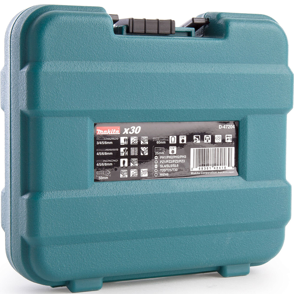 При этом в самом наборе Makita D-47204 тридцать предметов и среди них сверла по металлу, дереву и кирпичу диаметром от 3 до 8 мм. Биты длиной 25 мм - под любые головки крепежа  – типа PH, PZ и Т, держатель для них стандартный – длиной 6 см.