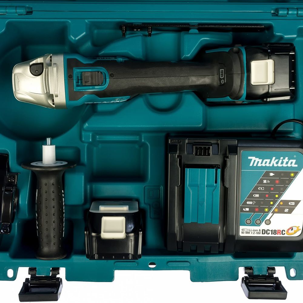 В кейсе с инструментом Makita DGA506RME уложены не только защитный кожух, боковая рукоятка, шлифовальный круг и ключ для его установки. Нашлось там место и для пары аккумуляторов и зарядного устройства к ним. В этой модели используются слайдерные литиево-ионные блоки напряжением 18 В и емкостью 4 А-час. Их емкость может быть и большей, ведь компания Макита предлагает блоки серии BL18ХХ уже на 6 А-час.
