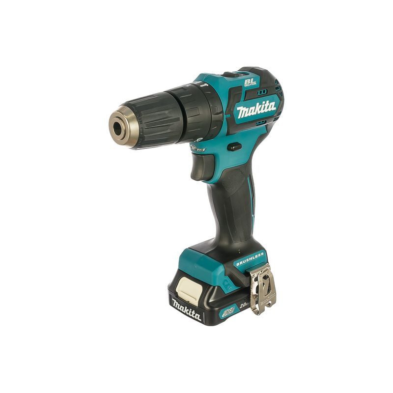Патрон у дрели-шуруповерта Makita HP332DWAX1 - под диаметр концевика 10 мм, конструкция – быстрозажимная. Это означает, что для установки и снятия рабочей насадки достаточно простых манипуляций с зажимной муфтой – дополнительного ключа не требуется. Очень удобно ещё и посадочное место для четырех бит или сверел длиной до 45 мм  в нижней части рукоятки. Они, как и крепление для крючка для подвески, располагаются с двух сторон.
