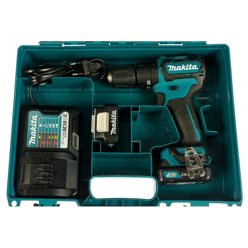 В комплекте поставки дрели-шуруповерта Makita HP332DWAX1 есть даже кобура для его переноски и 4 биты. Но, самое главное, в кейсе с этим инструментом находятся пара литиевых аккумуляторов на 10,8 В и зарядное устройство к ним. Это позволяет использовать инструмент практически непрерывно, не дожидаясь, пока будет готов к работе разряженный аккумулятор.