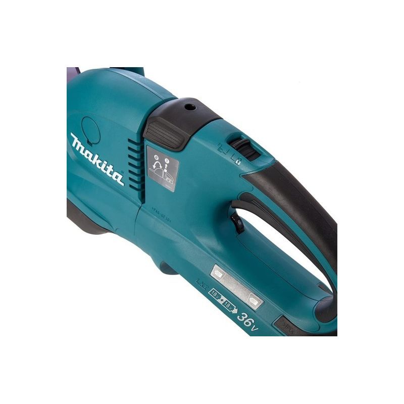 Управление включением кустореза Makita DUH651Z реализовано с учетом того, что в нем используется режущий инструмент. Система включения двойная, то есть, для того, чтобы привод начал работать, пользователь перед нажатием на курок должен нажать на кнопку разблокировки.