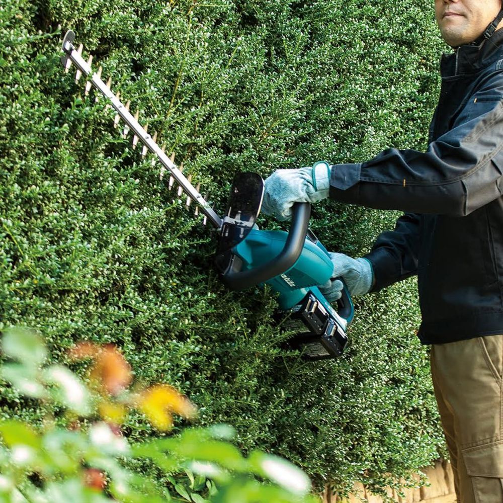 Кусторез Makita DUH651Z предназначен для формирования кроны живой изгороди, и его пользователь может выполнить эту операцию для любой  растительности весьма качественно. Связано это с оригинальной конструкцией рукоятки этого агрегата, позволяющей изменять её положение на 45 или 90 градусов вправо или влево. Но в любом случае производитель рекомендует выполнять обрезку в направлении снизу вверх.