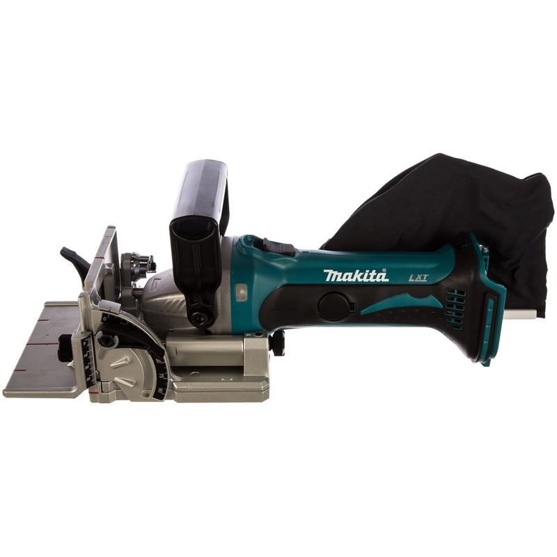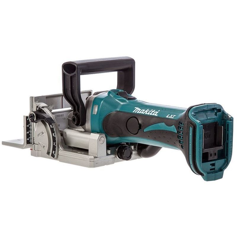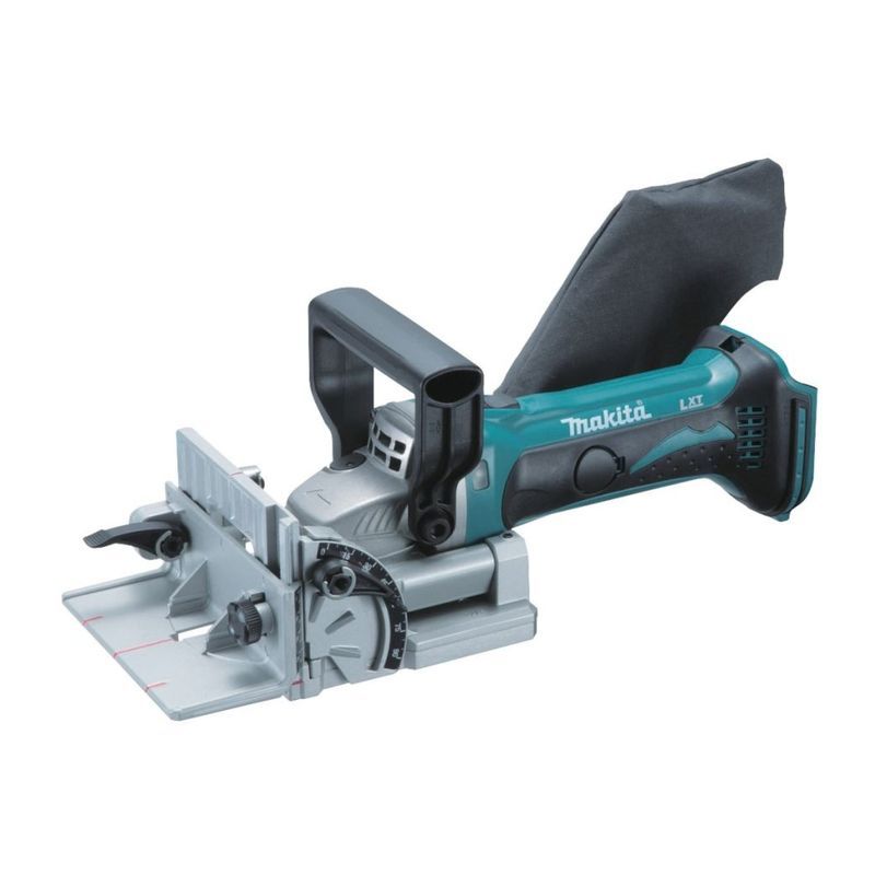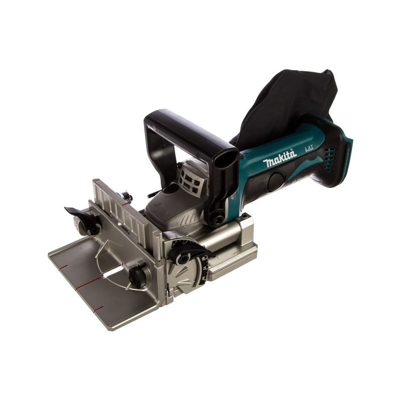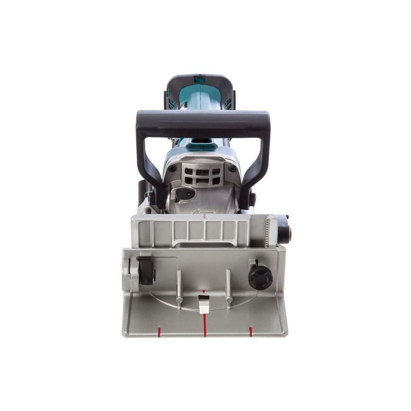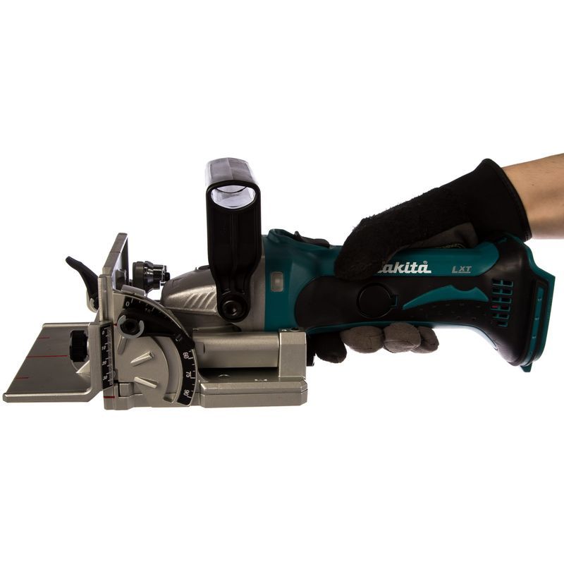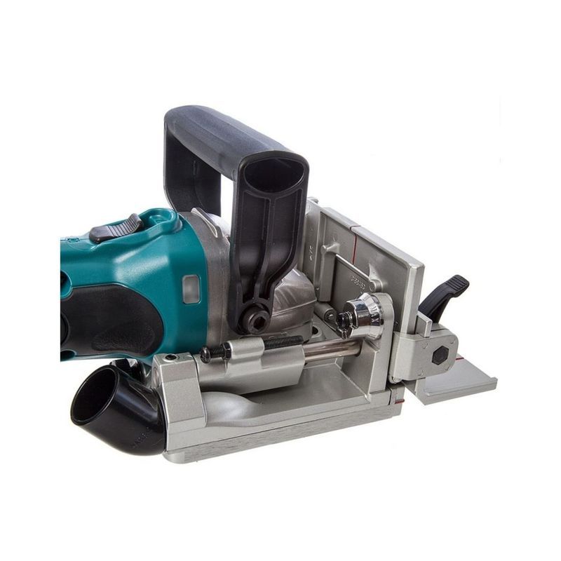 Для выполнения своей функции фрезер Makita DPJ180Z имеет все необходимое. Диском диаметром 100 мм можно пропиливать пазы в торце или плоской части заготовок на глубину до 20 мм. Её можно устанавливать в шести различных положениях в соответствии с размером стыковой накладки и более точно регулировать с помощью специального регулировочного винта.
