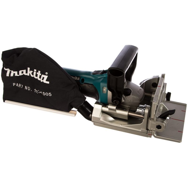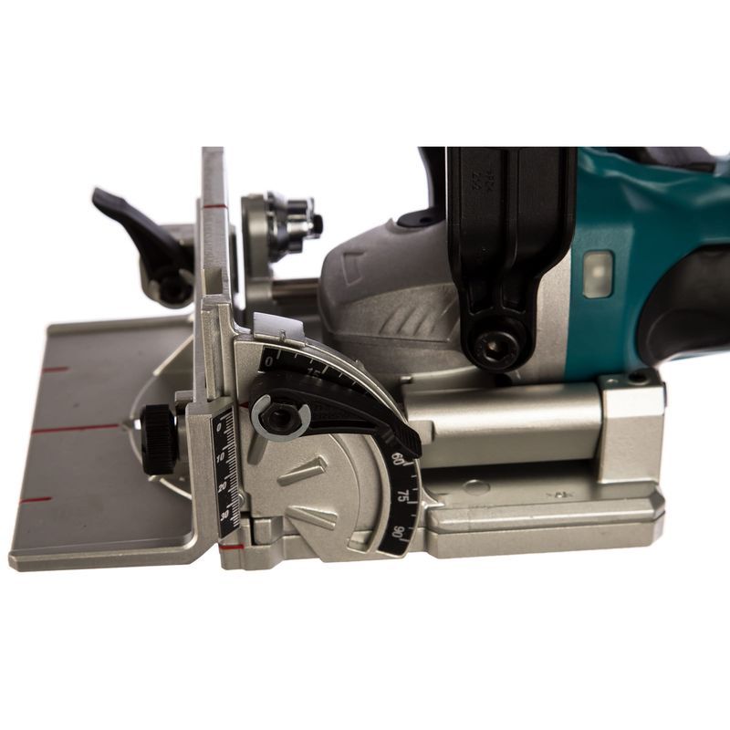 Положение пильного диска относительно верхней части детали во фрезере Makita DPJ180Z можно изменять. При этом настраивается положение его угловой направляющей, имеющей шкалу. Она показывает расстояние до центра пильного полотна. Эту деталь при необходимости возможно снять.