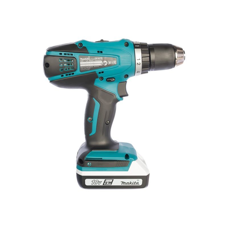 Электропитание инструмента Makita DF457DWLE производится от литиево-ионного аккумулятора на 18 В. Следует помнить, что в этой модели устанавливается аккумуляторы серии LXT. Аккумуляторного блока нет в комплекте поставки, но зарядное устройство в кейсе с инструментом имеется. Защита от перегрузки аккумулятора – трехступенчатая, от перегрузки по току, при перегреве и при снижении напряжения ниже допустимого уровня. При возникновении любой из этих ситуаций привод автоматически отключается.