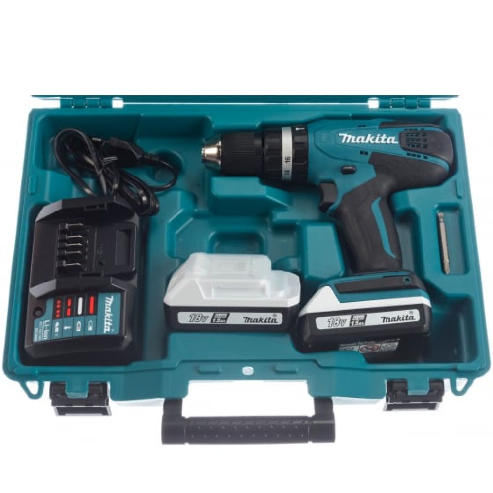 В кейсе с инструментом Makita HP457DWE уложены пара аккумуляторов и зарядное устройство к ним. Это важно не только для готовности к непрерывной эксплуатации. Дело в том, что к аккумуляторам G-Series подходит только специальный зарядник, типа DC18WA. Ещё одна особенность – время зарядки. Его значение фиксировано – 1 час.