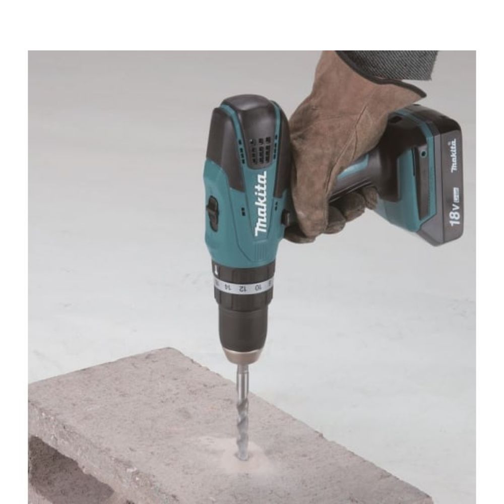 Двигатель в агрегате Makita HP457DWE снабжен целым комплексом средств, позволяющих эффективно использовать его во всех трех режимах – сверление, ударное сверление и работа с крепежом. Скорость его регулируется от нуля, а максимальное её значение можно установить с помощью механического переключателя.