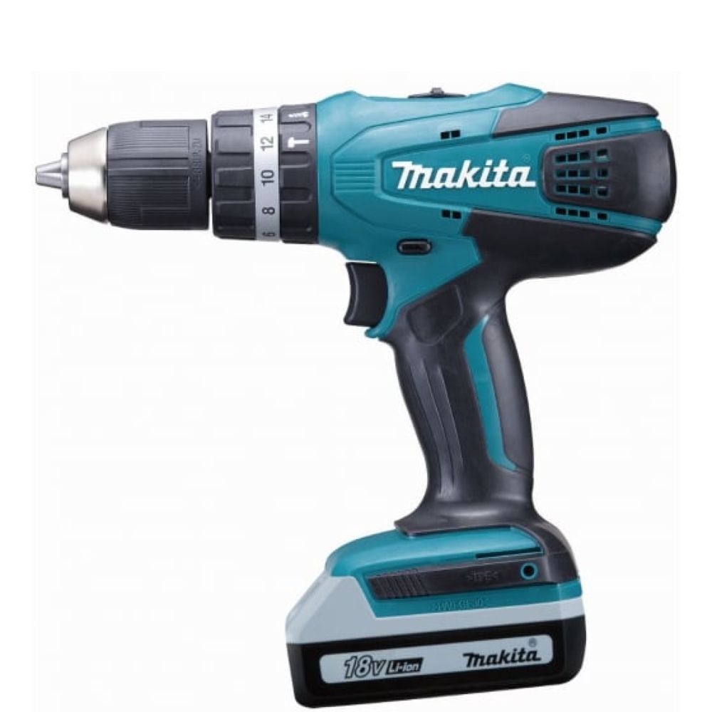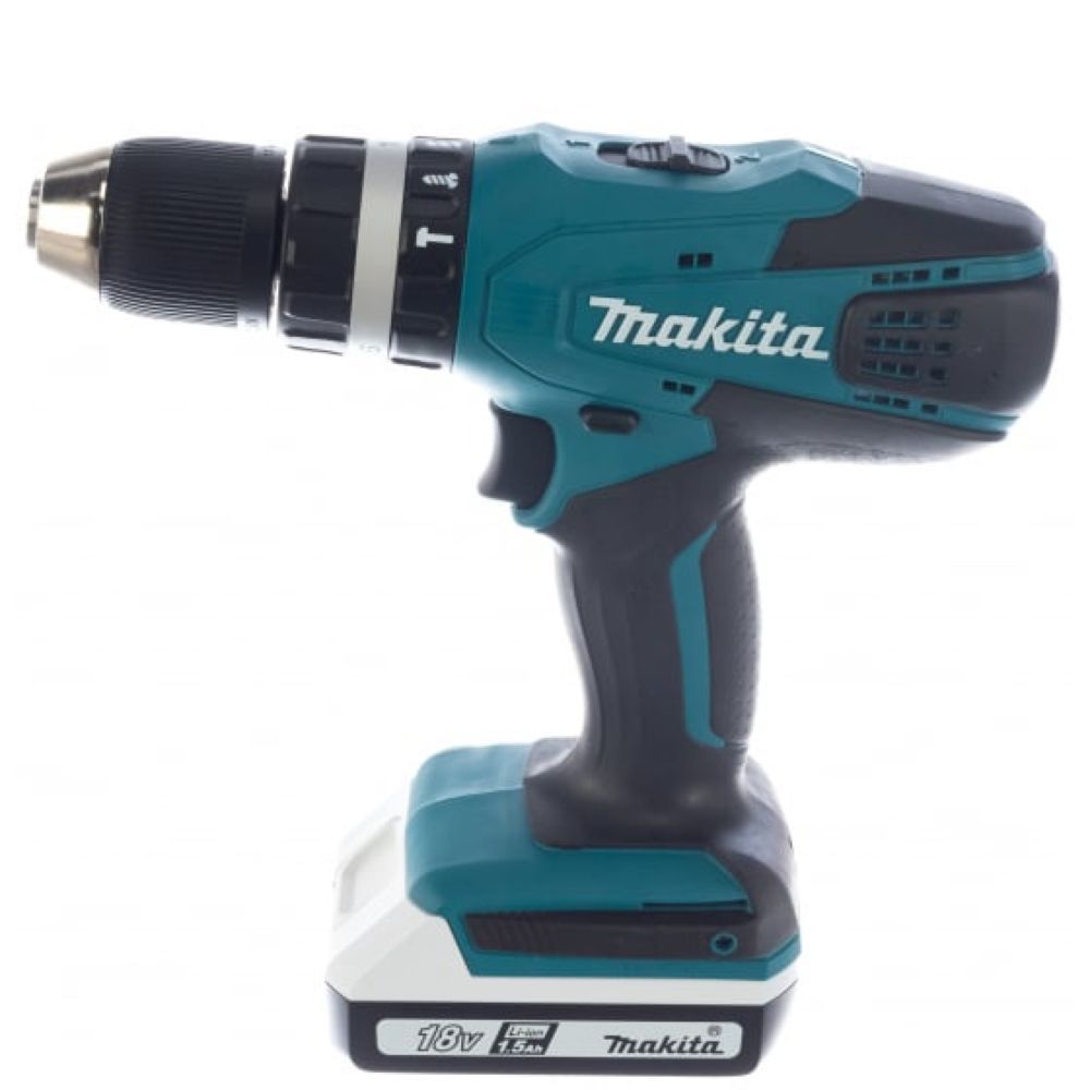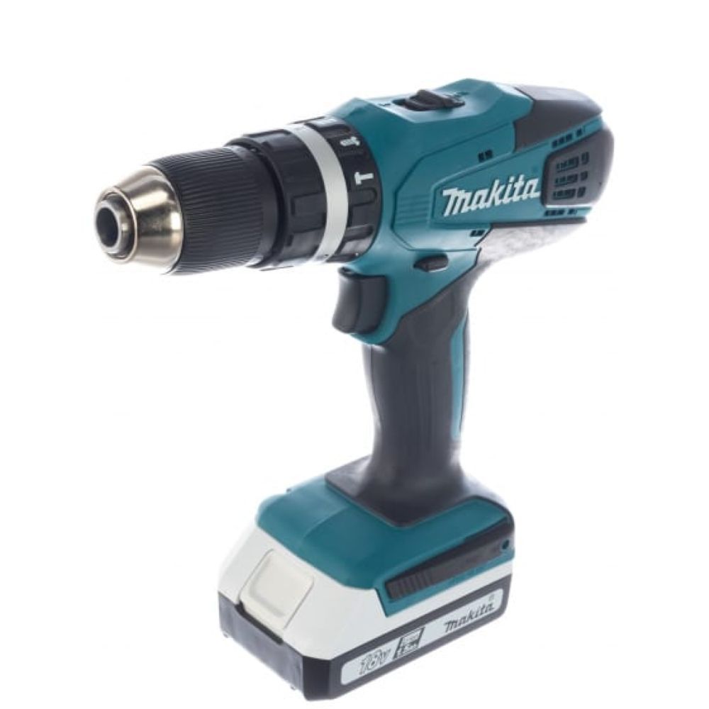 Аккумулятор в ударной дрели-шуруповерте Makita HP457DWE выдает напряжение 18 В при емкости 1,5 А-час. Как любой другой литиево-ионный блок в инструменте производства Макита, он снабжен защитой от перегрузки, перегрева банок батареи и недопустимого разряда. Привод инструмента в этих случаях просто откажется работать.