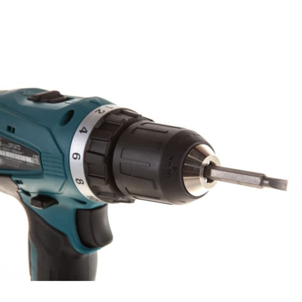 Другая полезная функция дрели-шуруповерта Makita DF347DWLE – наличие у двигателя электрического тормоза. Поэтому совершенно не нужное вращение патрона после отключения привода здесь исключено. Кстати, сам патрон у этой дрели не требует использования дополнительного инструмента, поскольку быстрозажимной. Установка и снятие сверла или биты производится одной рукой – за счёт поворота втулки. В него можно устанавливать сверла с диаметром хвостовика от 0,8 до 10 мм.