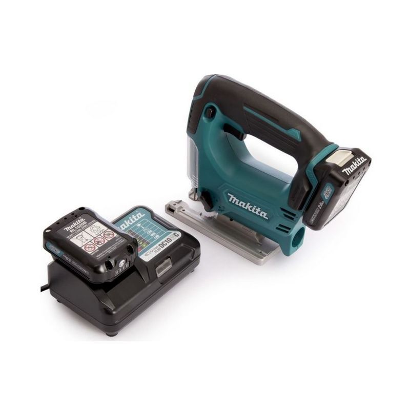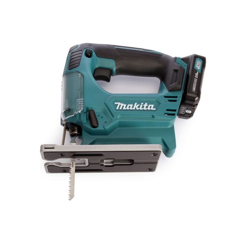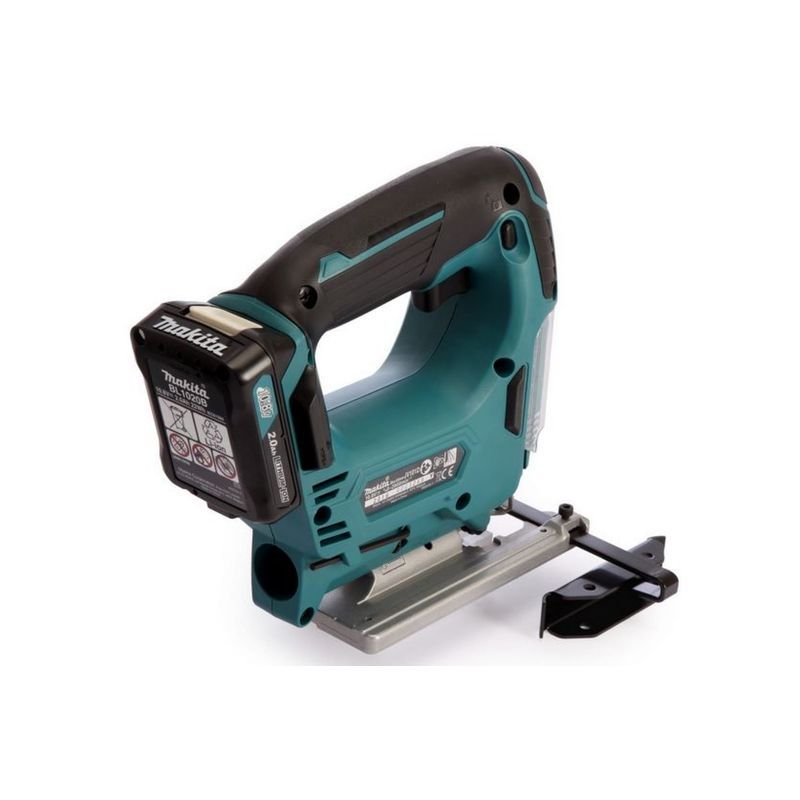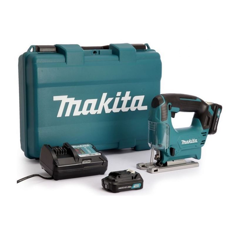 В комплект поставки инструмента Makita JV101DWAE входит 2 аккумулятора и зарядное устройство. Установить в него можно стандартный литиево-ионный блок напряжением 10,8 В типа BL1013 емкостью 1,3 А-час. От него питается двигатель, обеспечивающий маятниковое движение пилки на скорости от нуля до 2900 ходов в минуту с амплитудой 1,8 см. Аккумулятор в инструменте надежно защищен – электродвигатель автоматически  отключится при перегрузке и снижении уровня напряжения батареи ниже допустимого.