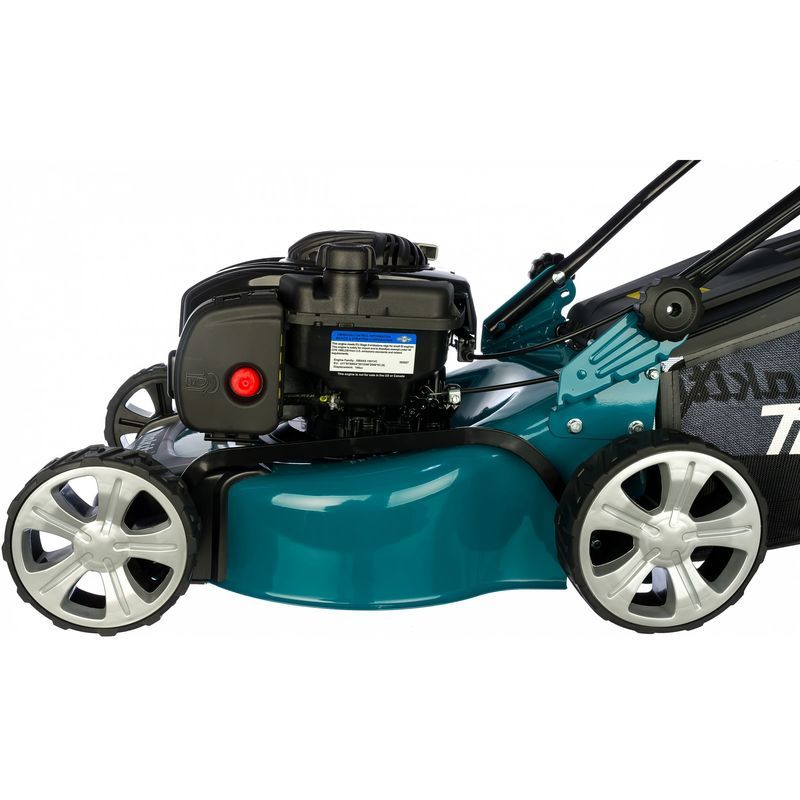 В газонокосилке Makita PLM4120N используется мотор Briggs & Stratton 500Е, развивающий мощность 2,7 л.с. при объеме 140 куб.см. Однако, основное преимущество связано не с мощностью, а с работой по 4-тактной схеме. Такой режим обеспечивает значительно меньший уровень вибрации, шумности и вредности выхлопа. Заправляется этот агрегат не топливной смесью, как традиционные для использования в газонокосилках «двухтактники», а обычным бензином. Емкость бака для него – 0,8 л, а заливается туда автомобильное топливо.