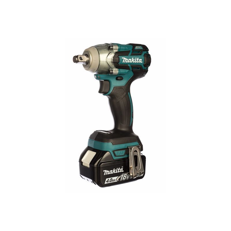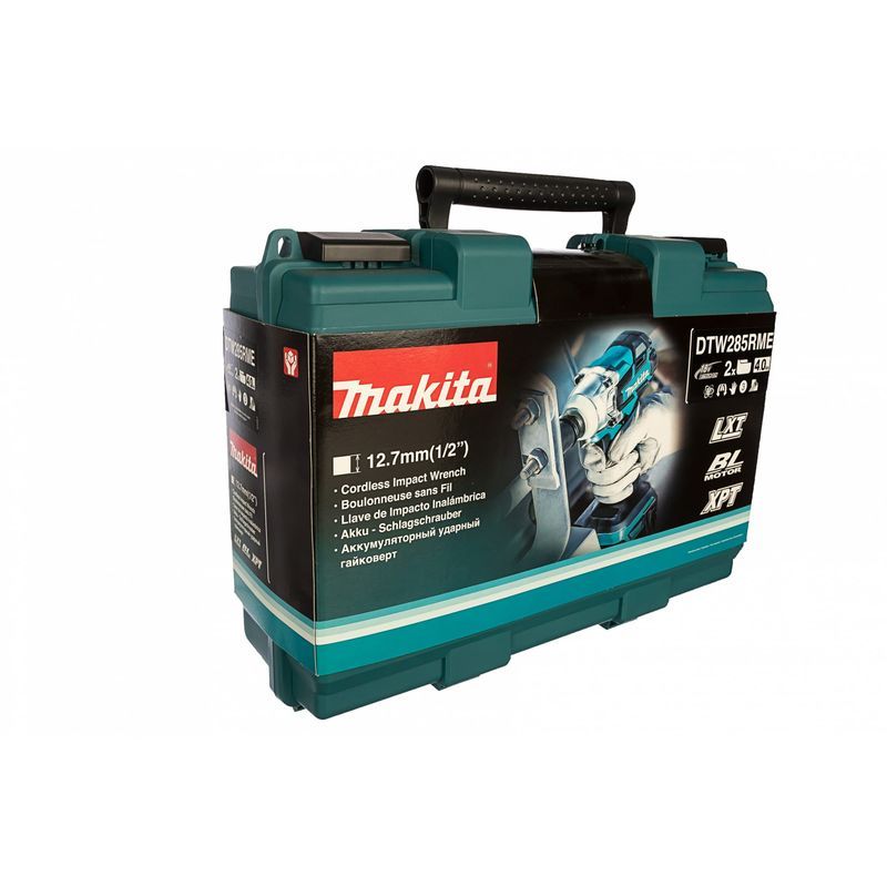 В гайковерт Makita DTW285RME устанавливается слайдерный литиевый блок напряжением 18 В и емкостью 4 А-час. В комплекте поставки их пара, уложено в кейс с инструментом и зарядное устройство к ним. Унифицированное посадочное место позволяет установить в инструмент блоки с меньшей или большей емкостью – от 1,5 до 6 А-час. При этом вес инструмента изменится всего на 200 грамм – с 1,5 до 1,7 кг.